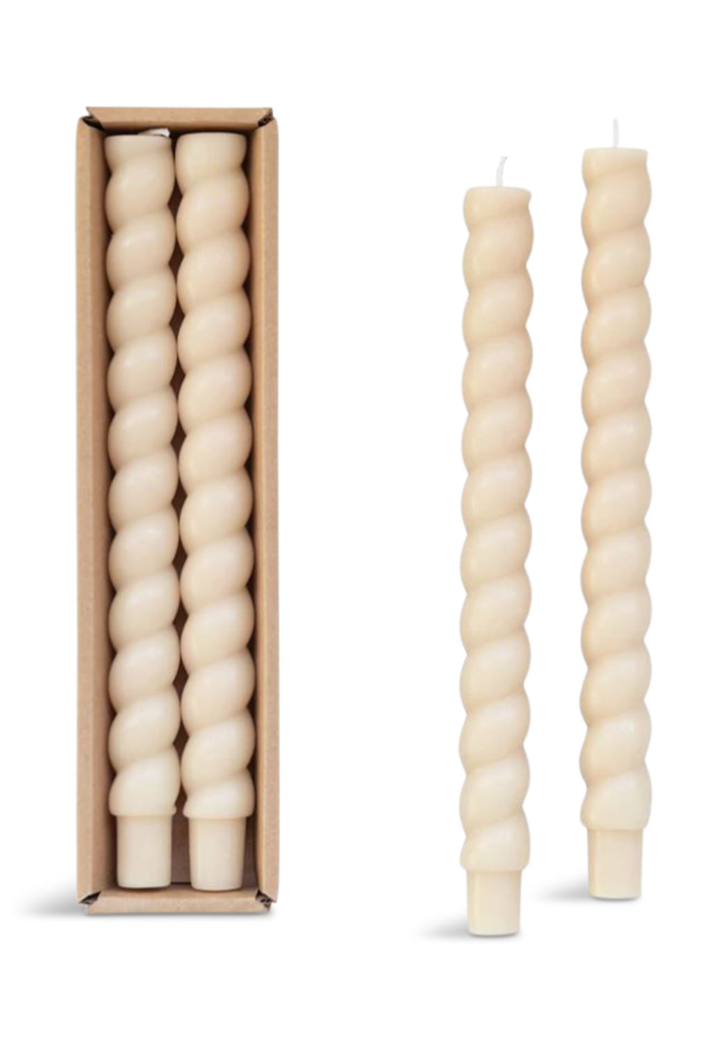Introducing the Twisted Taper Candle Set Of 2 by HOM Furniture, the perfect addition to your home décor collection. This set includes two unscented taper candles in a beautiful cream color, featuring a unique twisted spiral pattern for added elegance. Each candle has an estimated burning time of 10 hours, ensuring a long-lasting ambiance in any room. Pair these candles with a complementary candle holder for a complete and stylish look. Elevate your space with the Twisted Taper Candle Set from HOM Furniture.
