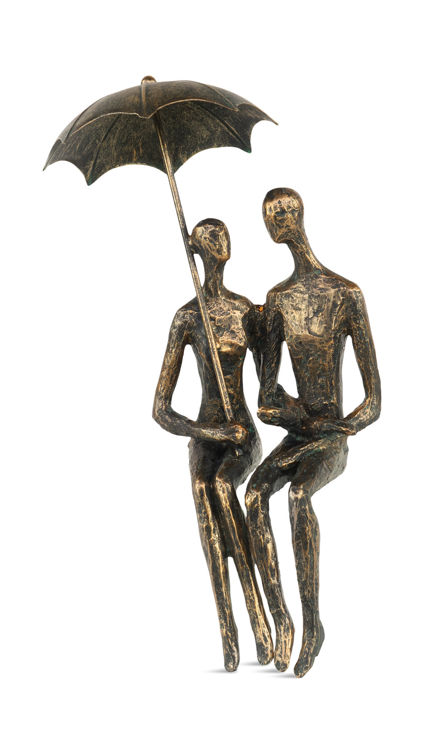 A couple posed beneath their open canopy, the Umbrella Couple are finished in bronze and can rest on any flat shelf or other surface. The simple, modern presentation is executed in resin and will be a fun addition to any casual environment.