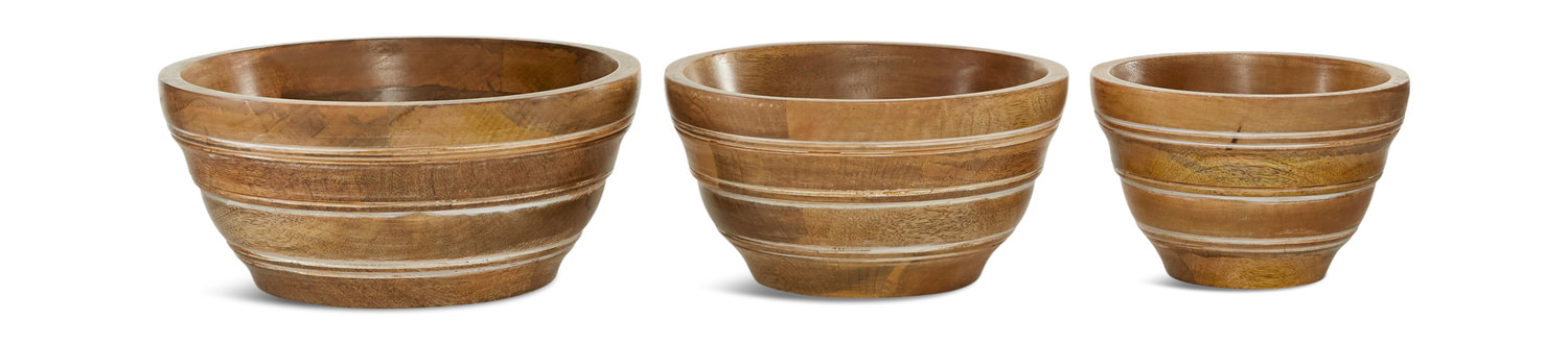 A deeply set wooden bowl with Mediterranean style crafting, the Wood Bowl Set of Three, may be used for serving or for decorative purposes. Use them to display decorative orbs, silks, or other personal items, or simply use them to serve in daily activity. The bowls show the natural beauty of each individual bowls' woodgrain.