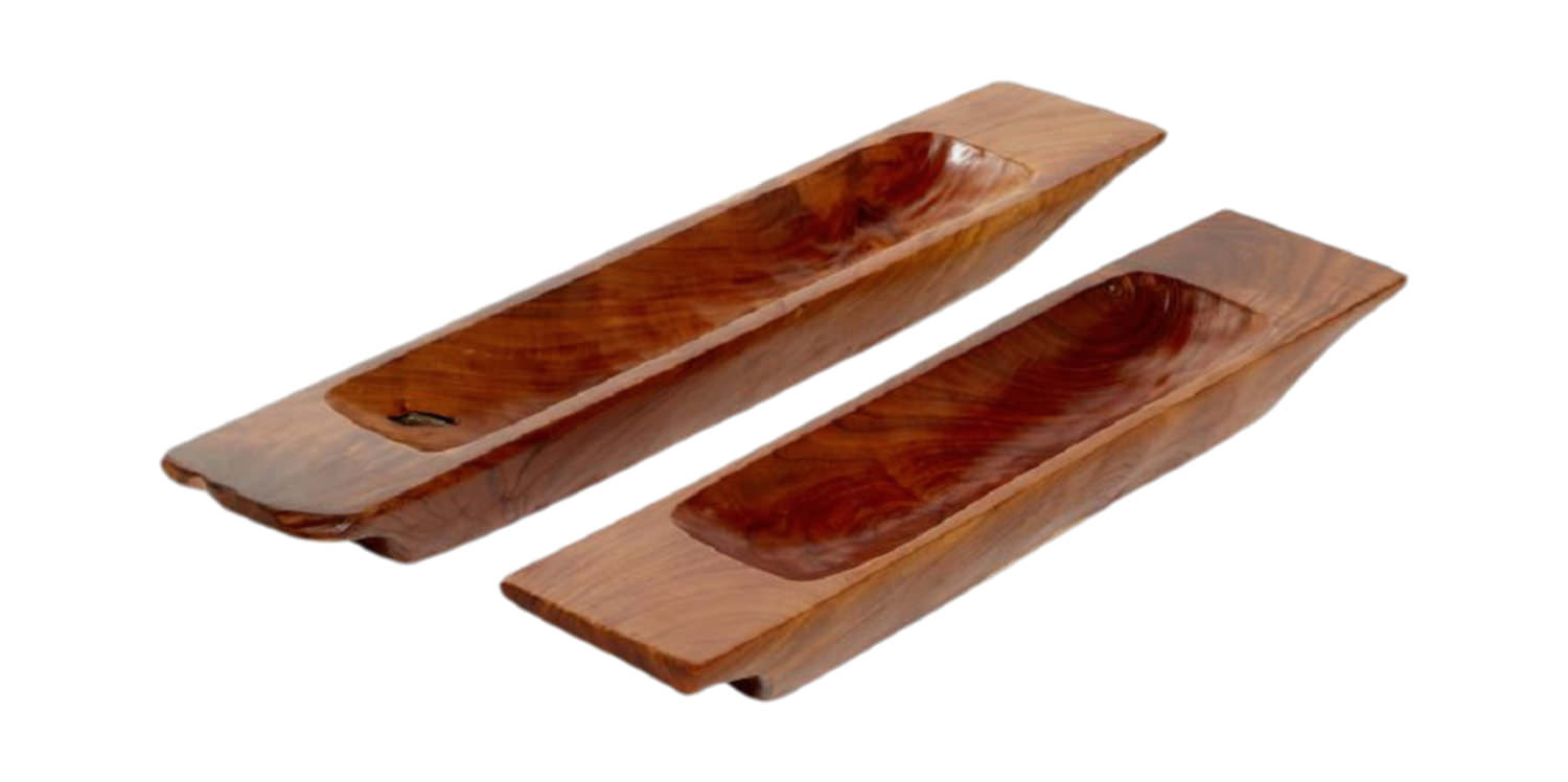 Fashionable, the Wood Trays - Set of 2, offer functional decorative purpose (not food safe) for any console, shelf, table, or other surface. These rectangular, ship bowls, are composed of carved teak with a high gloss, driftwood finish. Beautifully display garland, or spheres, and other fun decorative items with these inspirational and sophisticated vessels.