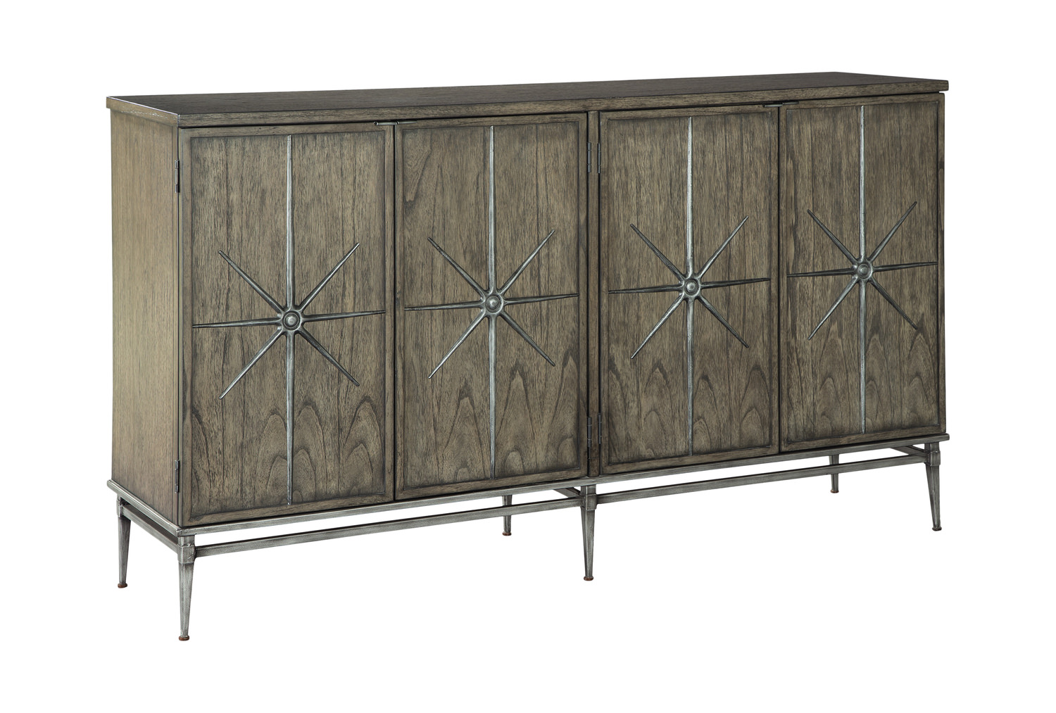 The Akira Media Console is a transitional piece that boasts an antique pewter star overlay to add a touch of elegance to any living space. With two shelves hidden behind doors, you can easily organize and display your media essentials. Plus, the outlet pack makes it convenient to plug in your devices without any hassle. Elevate your entertainment area with the Akira Media Console - a perfect blend of style and functionality!