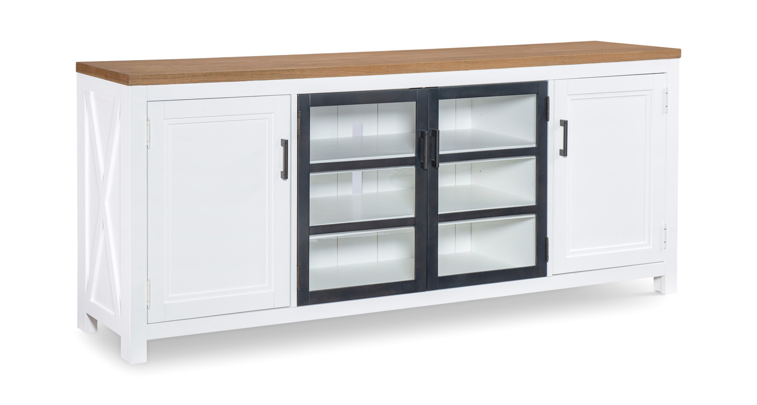 The Palmer Collection, a fresh Modern Farmhouse style, features a black window frame design, a quartered oak veneer top, and a bright white finish. This media stand has wire management access and adjustable shelves.