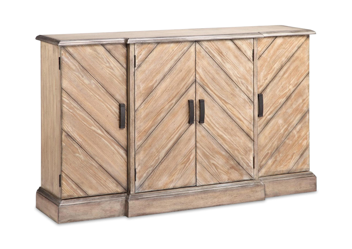 The Raymond four door console has a chevron plank pattern on the door fronts. The sides have a hand-painted oatmeal finish and the top has metallic grey trim. It has three adjustable shelves and features a media hole in back for cable management.