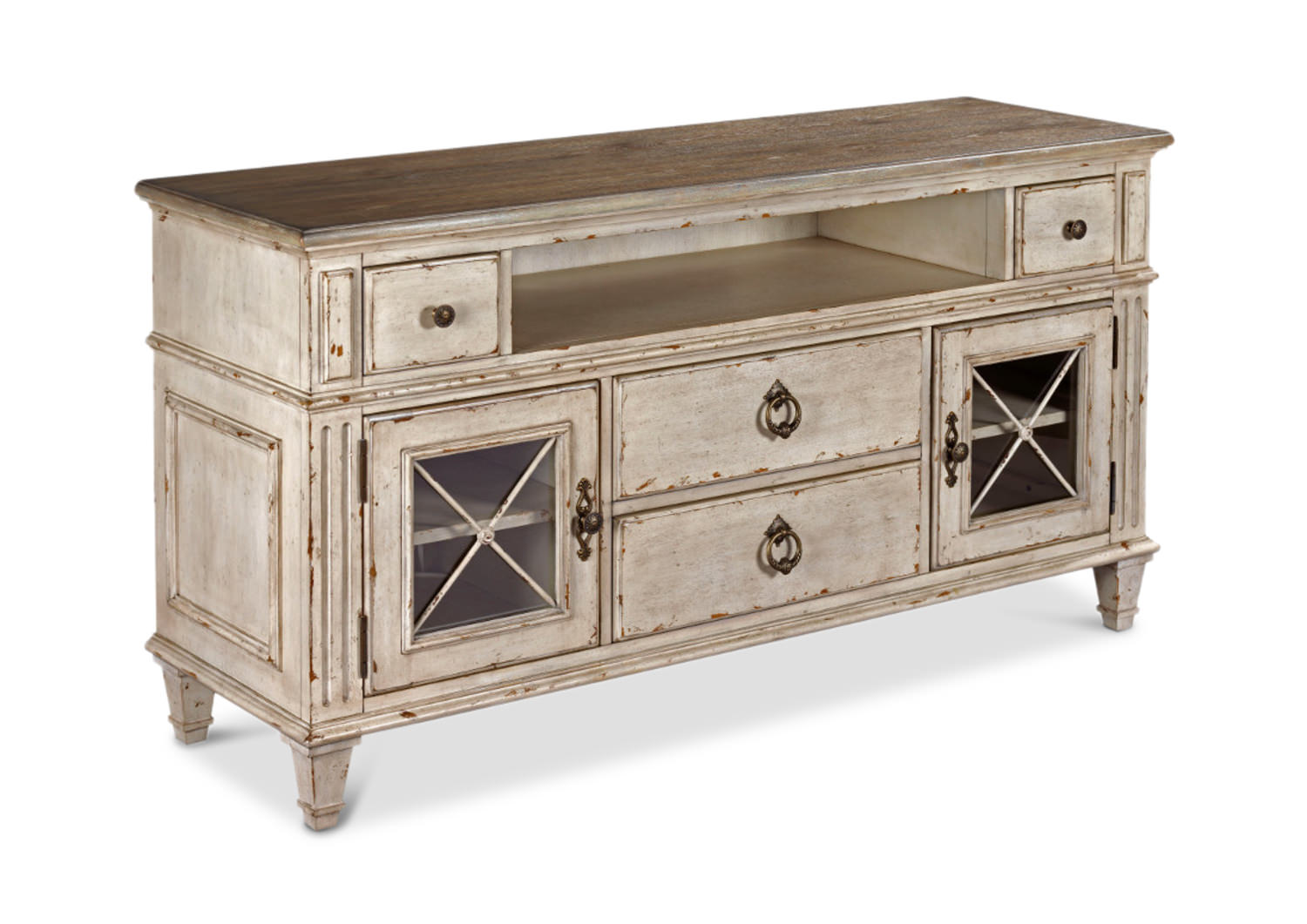 The Southbury Entertainment Console will warm up your room with its antiqued chipped paint and will create a time worn look. Features include four soft close drawers, two doors, a center opening for components, power bar and an adjustable shelf behind the door. Occasional is also stocked in this collection.