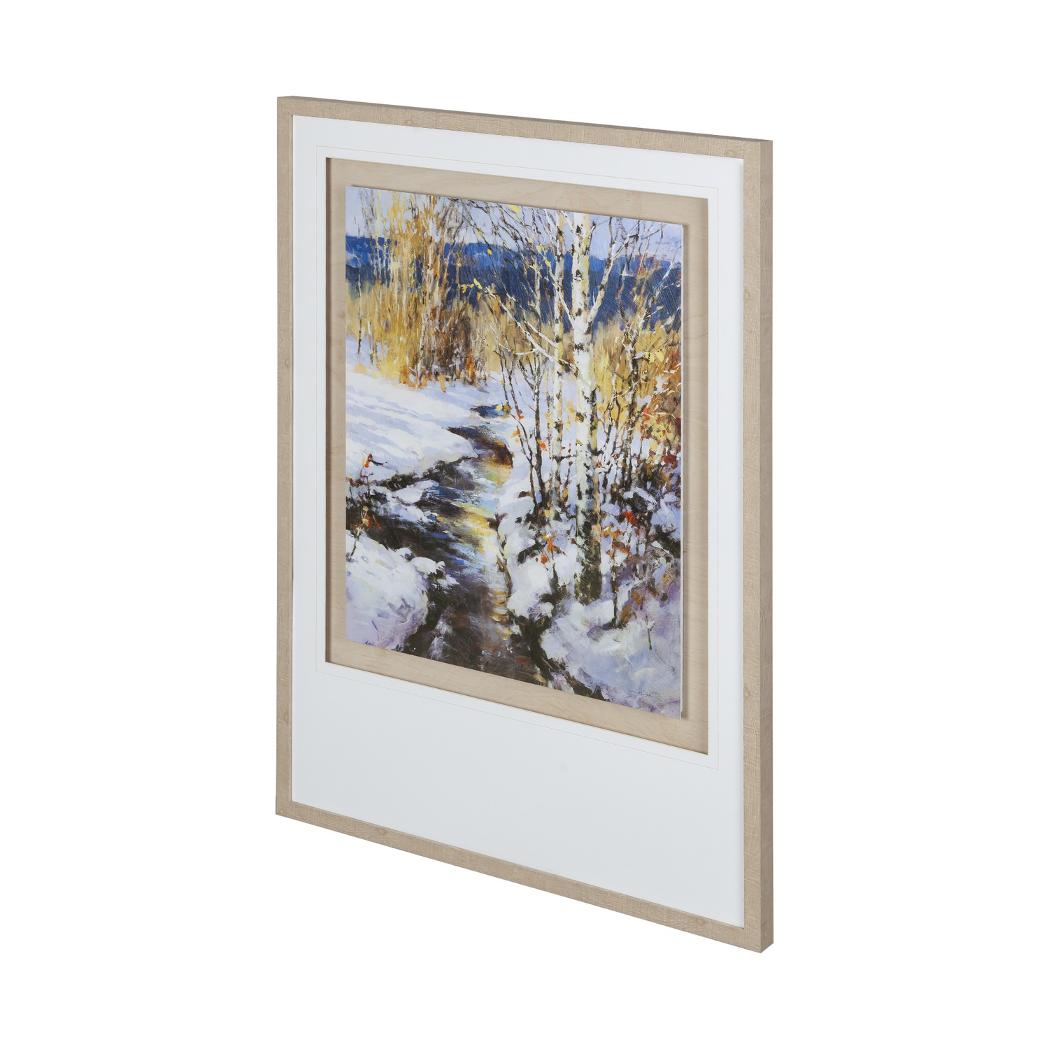 Modest Birch Trees with golden shrubs in a snowy landscape, the Back Country framed print features a narrow creek. A crisp and fresh scene, this casual and comfortably cool artwork in a natural frame will truly bring a candid, but streamlined look to the home.