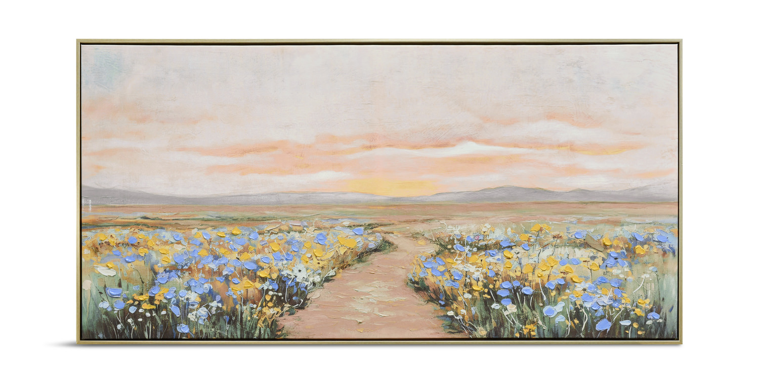 Step into a serene and picturesque scene with the "Be One Traveler" Framed Art Canvas from HOM Furniture. This stunning piece features a pathway winding through a lush grassy field adorned with vibrant blue and yellow flowers, all under the warm glow of a mesmerizing sunset. The light ivory frame beautifully complements the botanical subject, bringing a touch of casual style to any space. Add a pop of color and a sense of tranquility to your home with this charming piece of art.