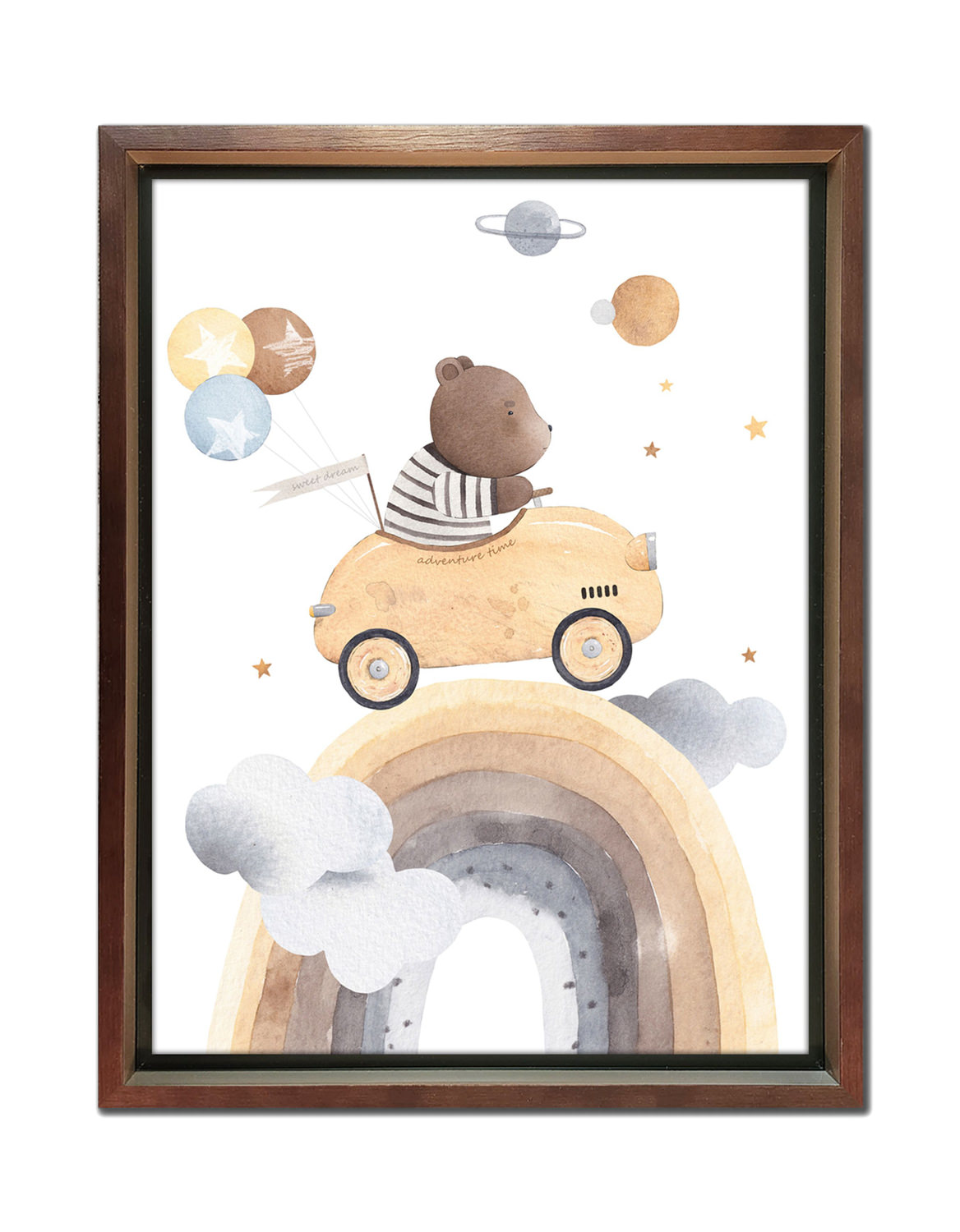 This delightful framed art from HOM Furniture Bear Rainbow Framed Art, adds a splash of youthful fun to any room. Featuring an adorable bear driving over the rainbow amongst the stars and planets, this piece is set against a white background and has a medium brown finished frame, that makes for an eye-catching contrast. The soft multi-color palette ensures an easy fit, drawing the eye and helping tie the room together. Plus, with our ‘Love It Guarantee', you can rest assured you’ll be happy with your purchase.