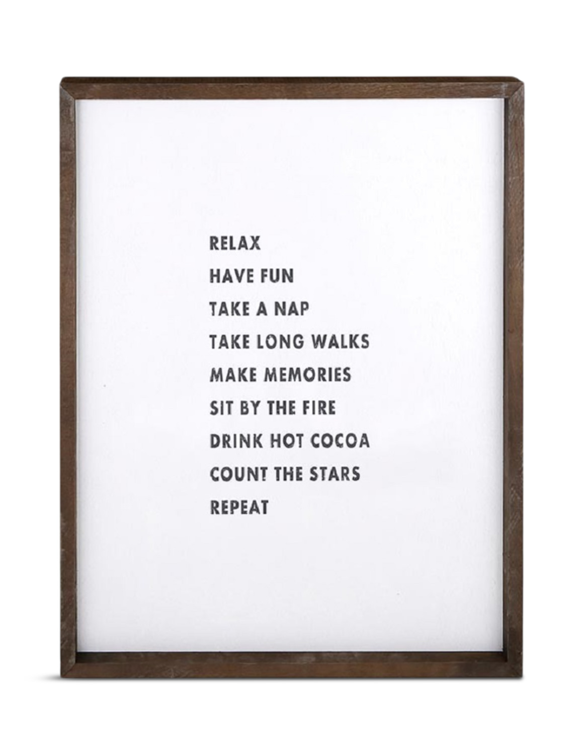 HOM brings you this stylish Paulownia wood-framed art Cabin Rules depicting a set of encouraging and happy phrases. The rectangular shape frame measures 20” wide by 27” high and features a brown finish with black print on a white background. The frame is spot-clean only for easy maintenance. Hang this cheerful artwork in your home or office to remind yourself of the positive things in life.