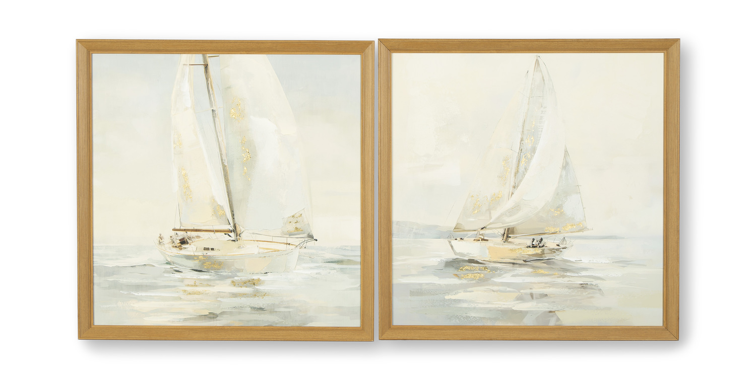 Introducing the Calm Seas Wall Art Set Of 2 by HOM Furniture, a perfect addition to your home décor. Let your mind drift away to the quiet beauty of sailboats gliding across the water with these soft and dreamy colors captured in graceful brush strokes. Each piece is delicately hand-painted with nautical charm, framed in a brown wood tone finish for a touch of elegance. Transform your space with the serene and tranquil vibe of this framed wrapped canvas set.