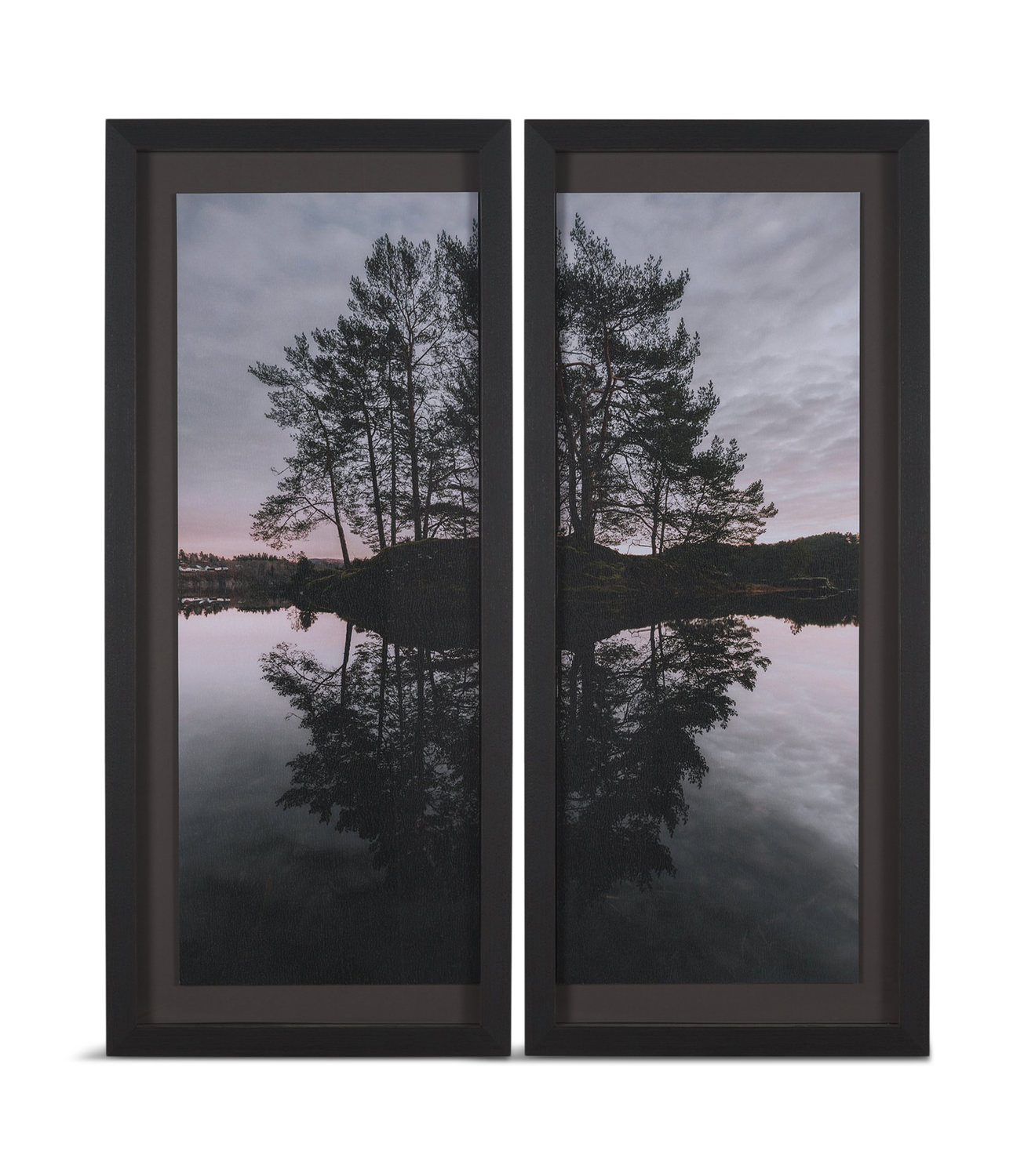 Immerse yourself in the serene beauty of nature with this exquisite Diptych Set Of 2 Framed Art by HOM Furniture. Each piece features a black frame that perfectly complements the hand-embellished texture, adding a touch of luxury to your space. The captivating silhouette of towering trees reflected in a tranquil lake brings the dawn and the calm surface of the water to life right in your home. With this framed art set, it is sure to elevate any room with elegant charm. Bring the outdoors indoors with this stunning piece from HOM Furniture.