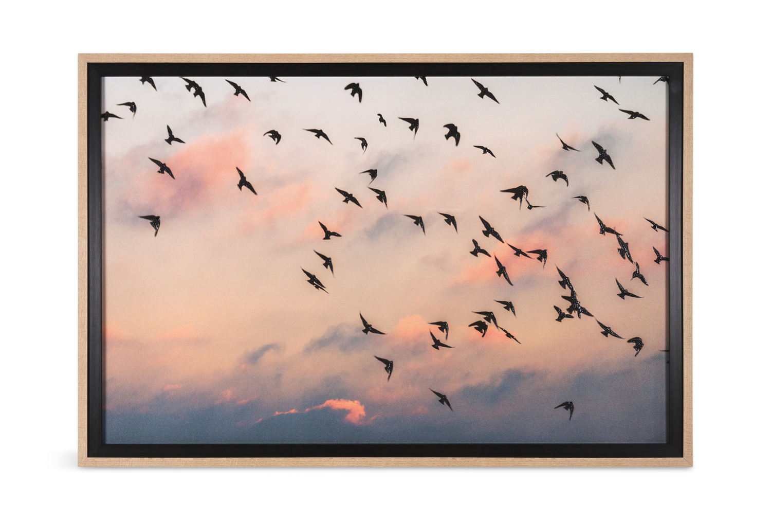 Introducing the Evening Flight framed art from HOM Furniture, a captivating piece that captures the beauty of a sunset in motion. This artwork features a sun setting background with a flock of birds gracefully flying across the horizon. The light brown wooded frame with an inset black frame adds a touch of elegance to the piece, making it a stunning focal point in any room. The horizontal orientation and hues of a setting sun sky create a soothing and peaceful atmosphere, perfect for adding a touch of nature-inspired charm to your space. Add a touch of serenity and beauty to your home with the Evening Flight framed art from HOM Furniture.