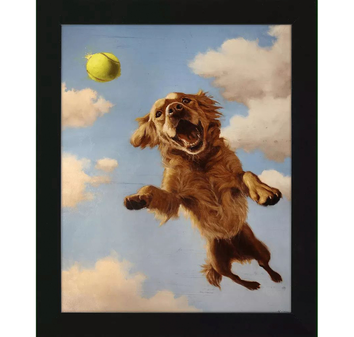 Introducing the "Fetch Framed Art" by HOM Furniture! This quirky piece is sure to bring a smile to your face with its hilarious golden retriever caught in mid-air trying to catch a tennis ball. The hand-applied enhanced gel finish adds a touch of luxury to this playful artwork. Framed in a modern flat black molding, this piece will add a pop of humor to any space. Get ready to unleash some laughter and style with the "Fetch Framed Art"!