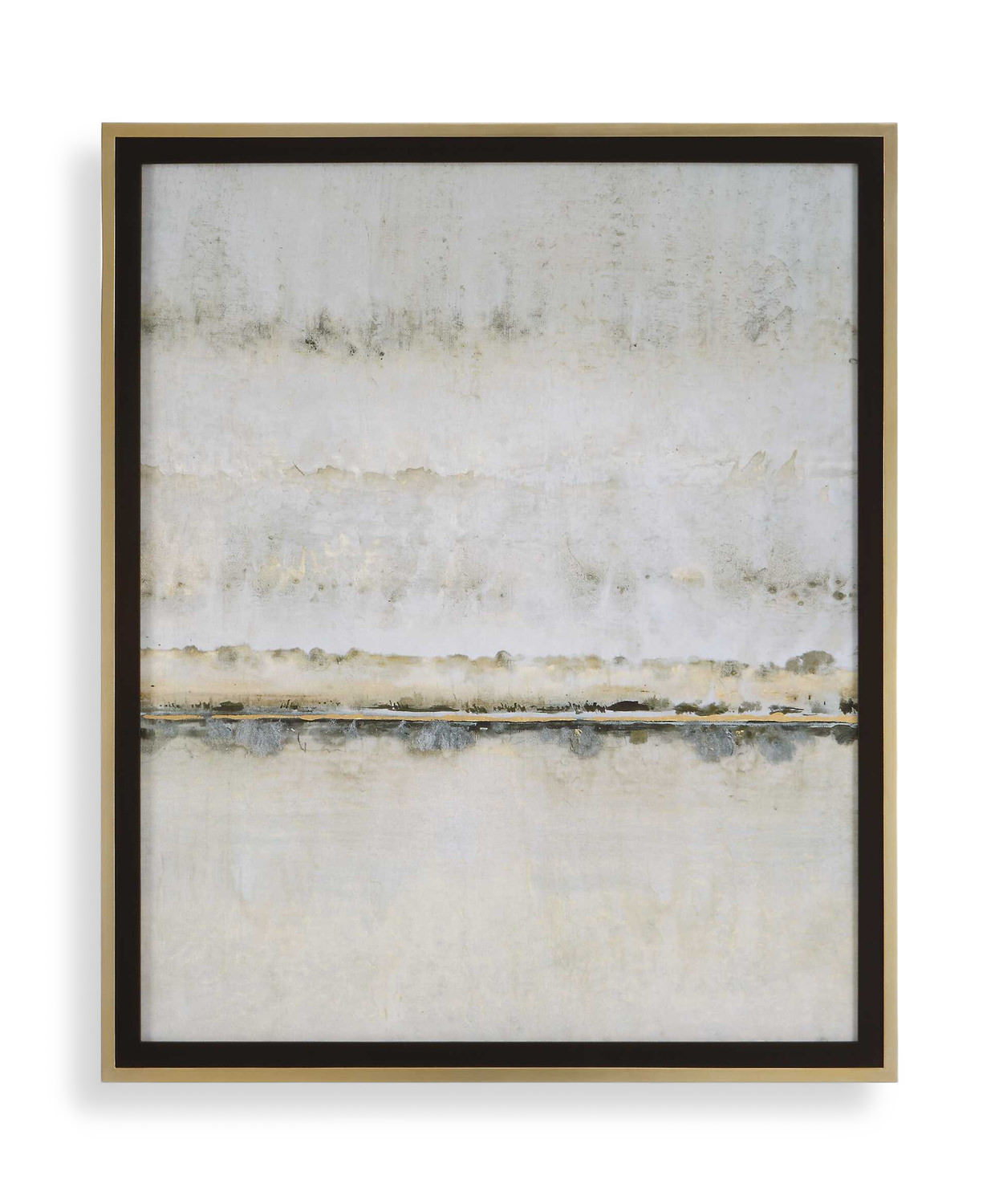 Elevate your space with the mesmerizing beauty of the Gilded Horizon Framed Print by Uttermost. Designed by the talented artist Tim O'Toole, this exquisite piece showcases an abstract landscape in a versatile neutral palette, accentuated by stunning gold leaf highlights. The antique gold leaf frame, with a sophisticated matte black inner liner, adds a touch of elegance to the artwork. Without the barrier of glass, the intricate details of the print truly come to life, making it a captivating focal point in any room. Embrace the serenity of nature with this timeless masterpiece from HOM Furniture.
