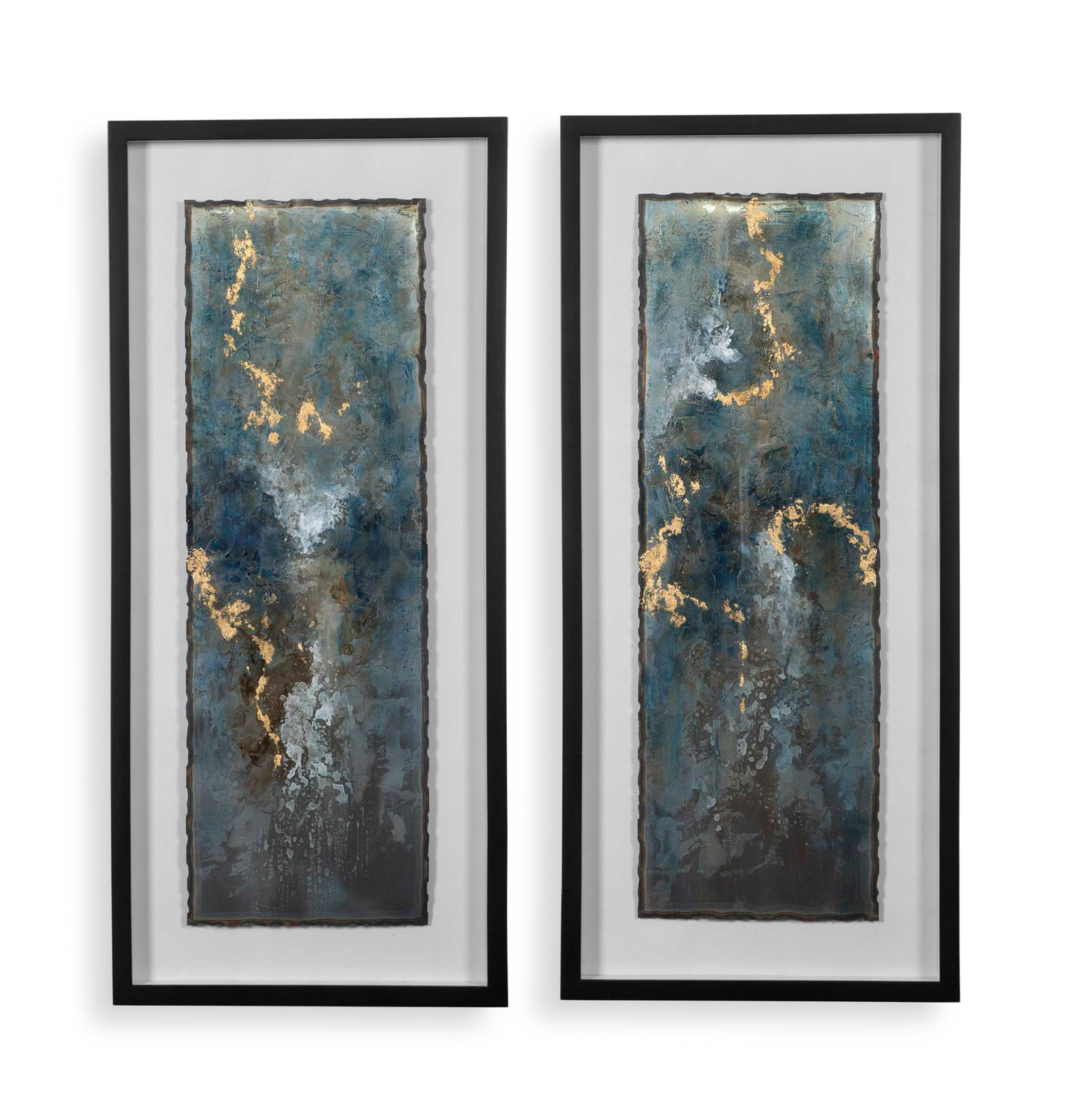 Elevate your space with the mesmerizing beauty of the Uttermost Glimmering Agate Abstract Prints Set/2, brought to you by HOM Furniture. Inspired by natural gemstones, these metal sheets are meticulously hand-painted in a harmonious palette of blue, turquoise, white, and gold leaf. The raw metal edge is elegantly softened by oatmeal linen backing, adding a touch of warmth to the artwork. Encased in a sleek black shadowbox style frame under glass, these pieces exude sophistication and style. Each artwork in this set features a unique torn edge detail, highlighting the handcrafted nature of the design.