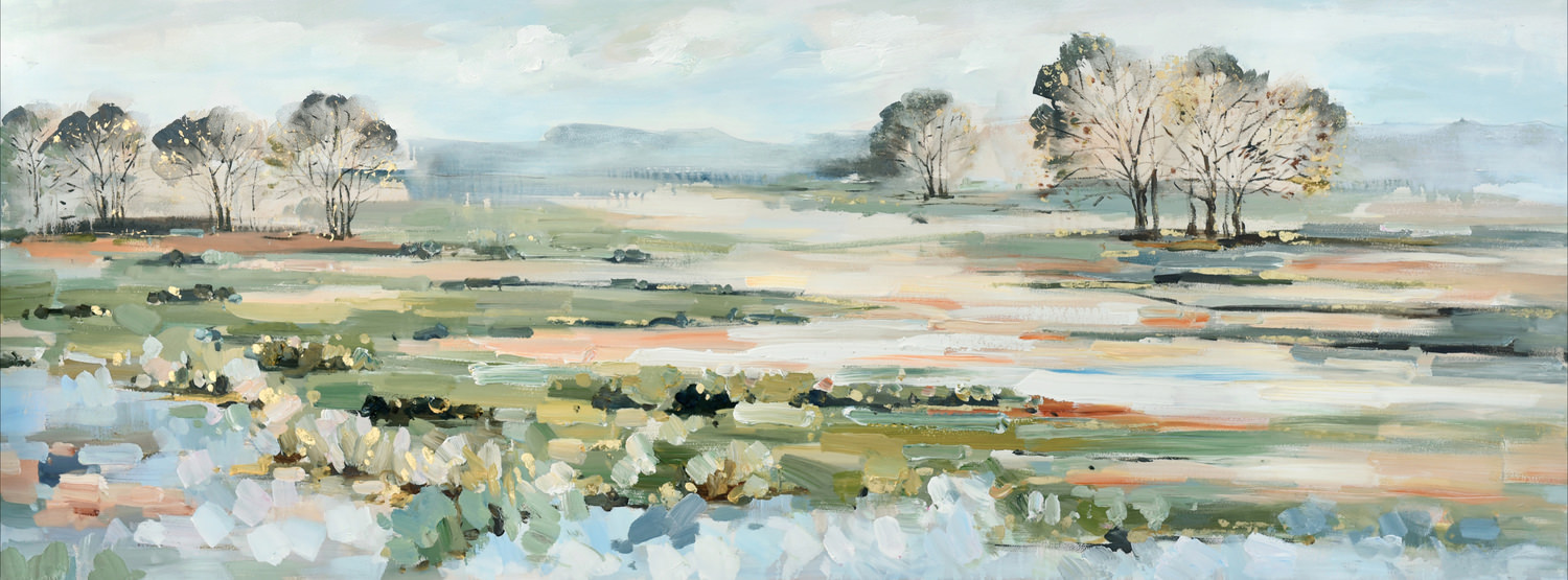 A mottled landscape in a contemporary presentation, the Glorious Valley is over five feet of colorful, hand embellished, countryside. Water in the foreground, the landscape follows back to the tree-lined perspective in the background of this picturesque, work on canvas.