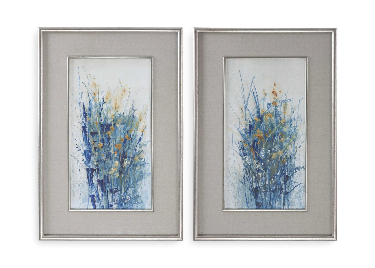 Elevate your living space with the exquisite Pale Gray Linen Fabric Mat from HOM Furniture. The frame and matching fillet boast a distressed silver finish with dark gray accents, adding a touch of sophistication to any room. These vibrant prints, part of the Indigo Florals collection, offer a modern twist on traditional floral artwork. The saturated indigo hues create a striking contrast against the golden accents and white background, exuding a sense of elegance and fluidity. Each print is elegantly surrounded by pale gray linen mats and placed under protective glass.