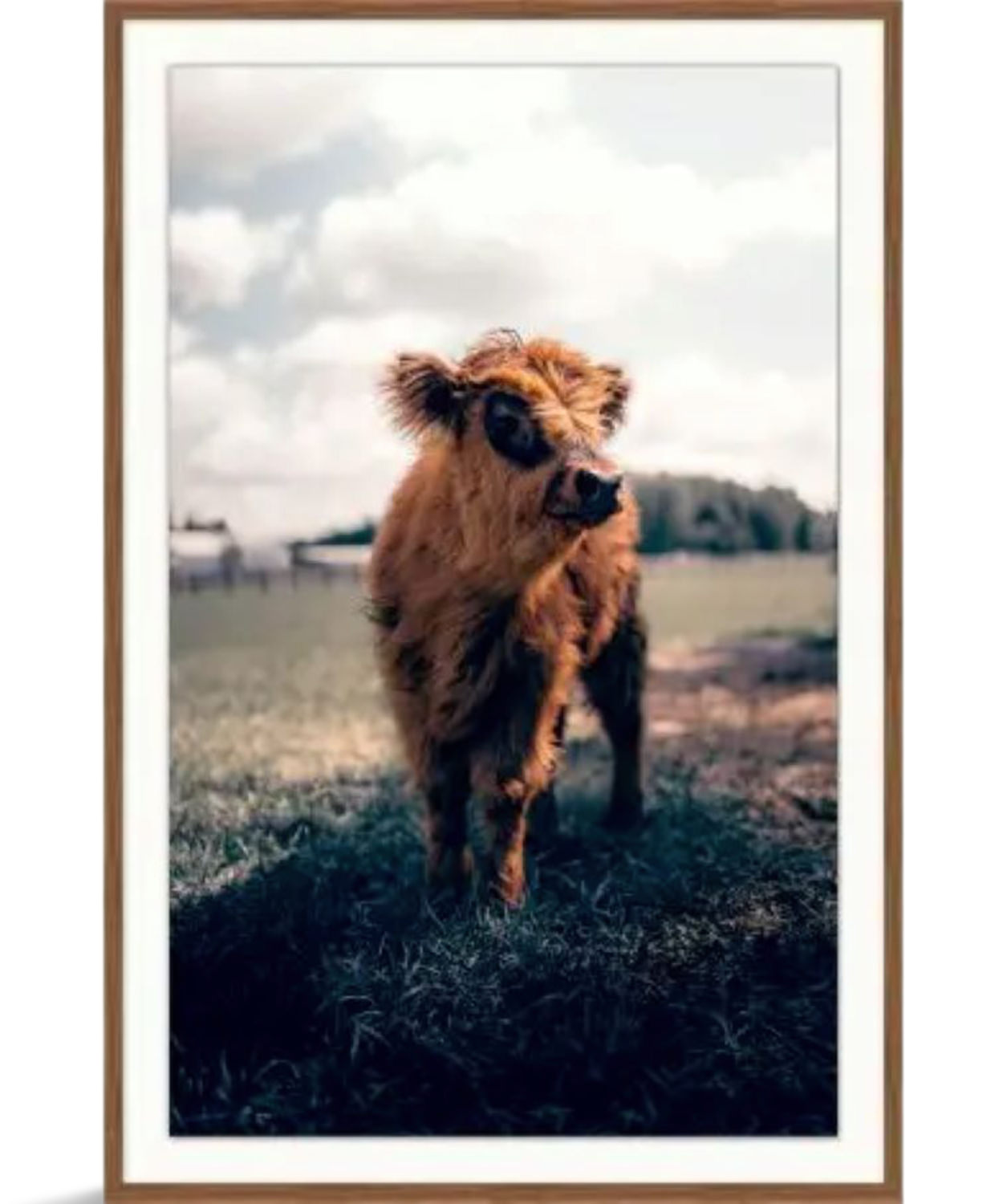 Introducing the "Innocent Gaze" Framed Art from HOM Furniture. This exquisite piece features an American ranch photograph captured on giclee matte paper, framed in a lined shadowbox with a walnut finish. The image depicts a serene scene of a brown cow standing and staring off into the distance under the cloudy skies. Add a touch of rustic charm and natural beauty to your space with this captivating artwork.
