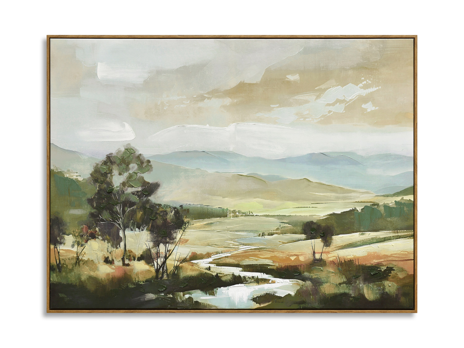 Embark on a visual journey like no other with the "Journey Awaits" Framed Canvas by HOM Furniture. This captivating piece features a breathtaking landscape, hand-painted with meticulous detail by skilled artisans. The frame, finished in a warm light brown wood tone, complements the earthy tones of green and brown, while pops of orange and blue add a touch of whimsy to the scene. Perfect for nature lovers and those with a keen eye, this framed art piece will bring a sense of adventure and serenity to any space.