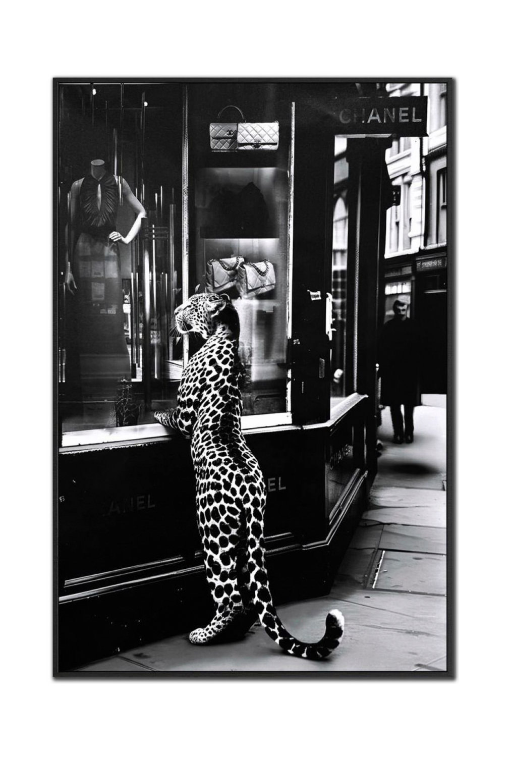 Introducing the exquisite Luxury Hunt II Framed Canvas from HOM Furniture, a masterpiece that perfectly encapsulates the essence of modern luxury and adventure. This captivating piece features a striking black floating frame that adds a touch of elegance to any space. The hand-embellished artwork showcases a wild cat on its hind legs, peering into a clothing and jewelry store, creating a sense of mystery and intrigue. With its fun and playful design, this artwork is sure to spark joy and conversation wherever it is displayed. The black and white color tones add a timeless appeal, while the modern style brings a contemporary flair to your décor.