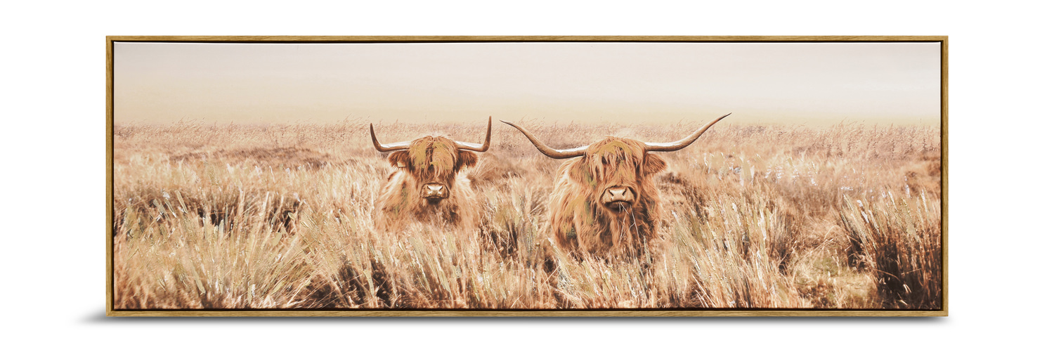Immerse yourself in the serene beauty of the countryside with our Not Alone Framed Canvas from HOM Furniture. This powerful piece features two magnificent highland cows gazing at you from a lush wheat field, creating a sense of calm and connection. Each detail is expertly hand-painted, bringing these majestic animals to life in stunning realism. The horizontal orientation of the canvas adds a sense of grandeur to any space, while the light brown wood tone frame enhances the casual and inviting feel of this artwork.
