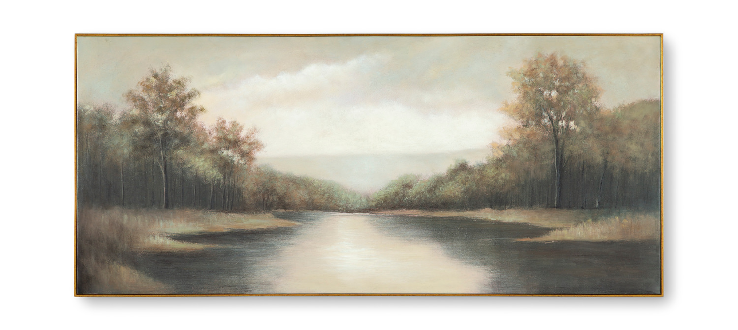 Transport yourself to a serene lakeside oasis with the "Parting Ways" Framed Art from HOM Furniture. This breathtaking piece captures the beauty of nature with a tranquil lakeside scene, complete with towering trees and majestic mountains. The antique gold finish on the frame adds a touch of elegance, while hand-painted embellishments bring a unique, artisanal feel to the artwork. Please note that some variations may occur due to the handcrafted nature of this piece, making each one truly one-of-a-kind.