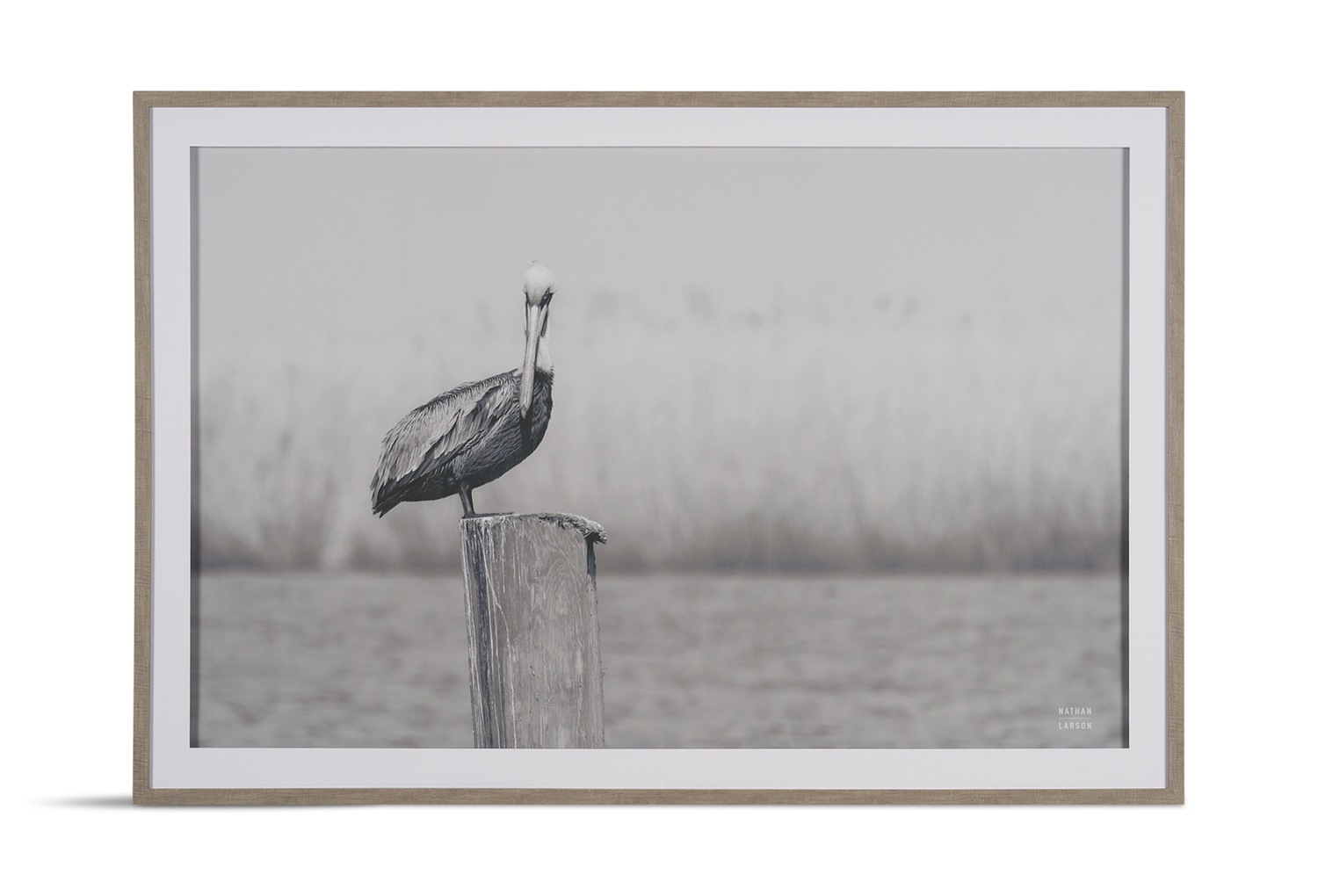 Immerse yourself in the tranquility of nature with the Pelican Stories Framed Art from HOM Furniture. This captivating piece features a stunning black-and-white photograph of a poised pelican perched on a weathered wooden post, set against a serene backdrop of blurred marshland and water. The grayscale tones create a sense of calm and sophistication, making it the perfect addition to any space seeking a touch of casual elegance. Let this exquisite piece bring a sense of serenity and grace to your home décor.