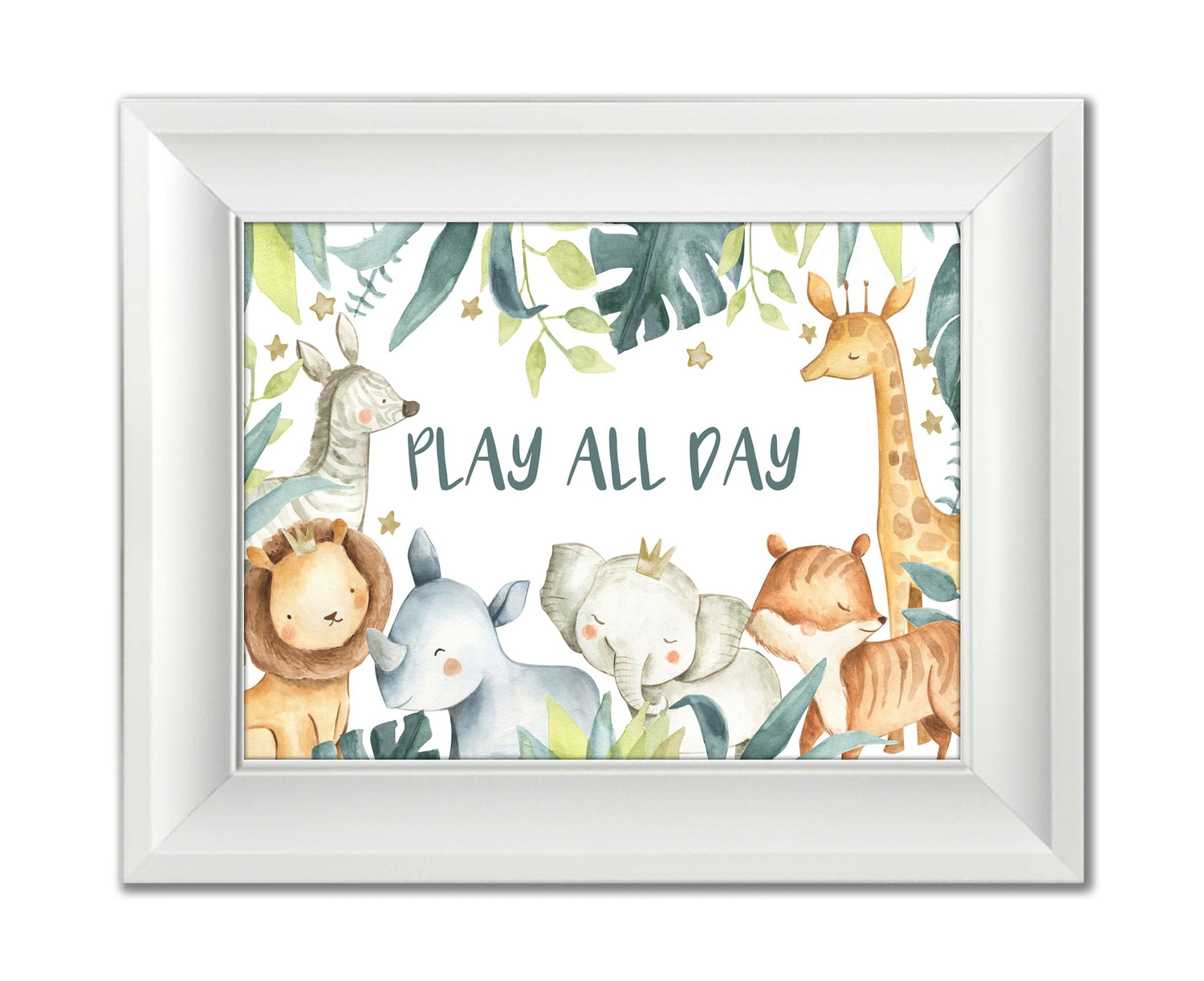 Add a playful touch to your home decor with this "Play All Day" Framed Print. This delightful wall art features an array of beautiful baby animals, including a fox, giraffe, elephant, rhino, lion, and zebra. Set in a soft color palette and finished with a white frame, this piece is perfect for any room that needs a youthful and vibrant touch. Bring the fun of the wild into your home with HOM's Play All Day Framed Print!