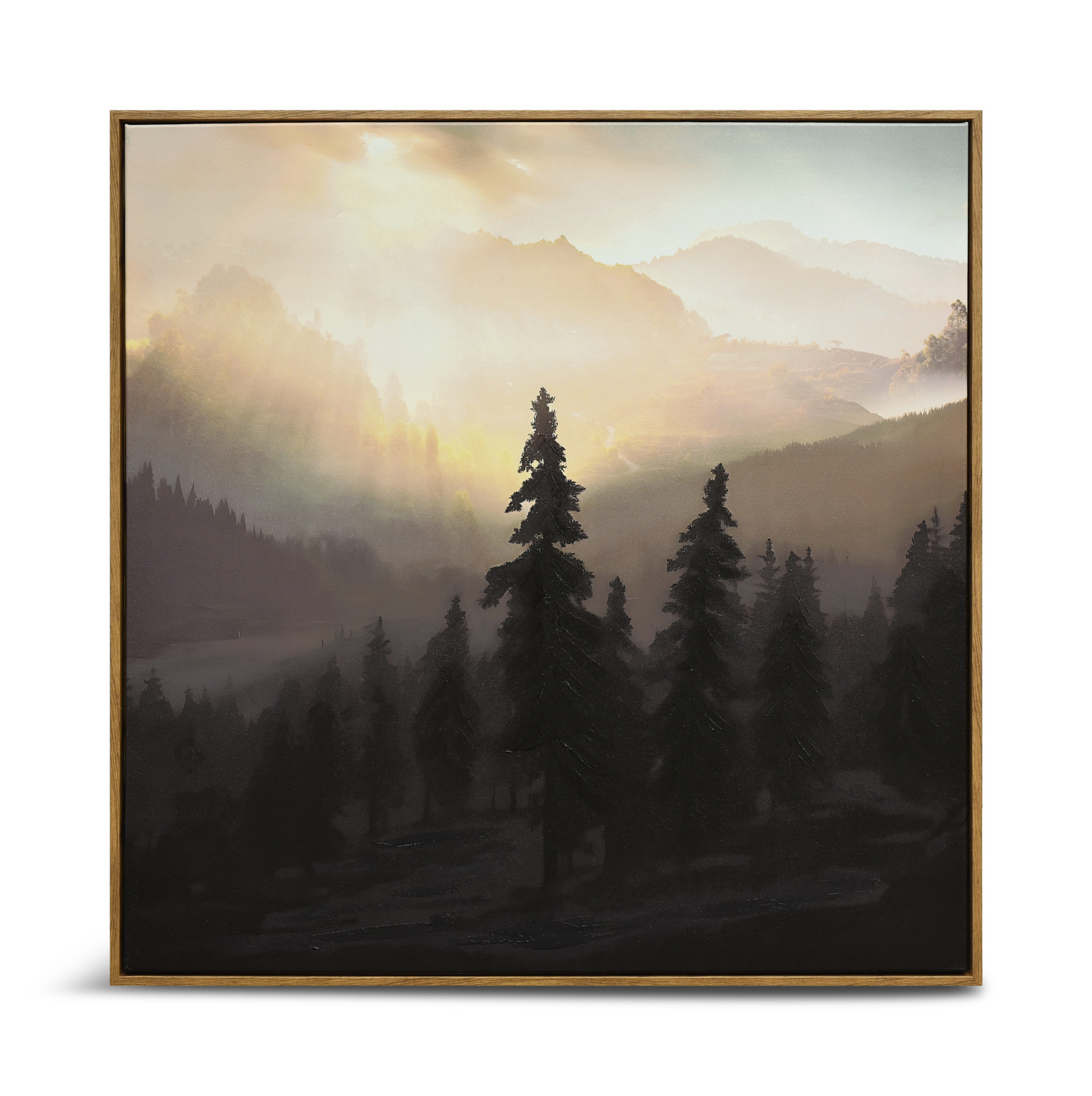 Introducing the Promises To Keep Framed Canvas by HOM Furniture, a stunning piece that captures the serene beauty of nature. With the sun peaking through the cloudy sky and casting its warm rays on the pine trees below, this artwork exudes a sense of tranquility and peace. The light brown frame complements the scene perfectly, while the distant mountain range adds depth and dimension to the composition. Ideal for those who appreciate a casual style with a touch of natural charm, this framed art piece is sure to bring a sense of the outdoors into any living space.