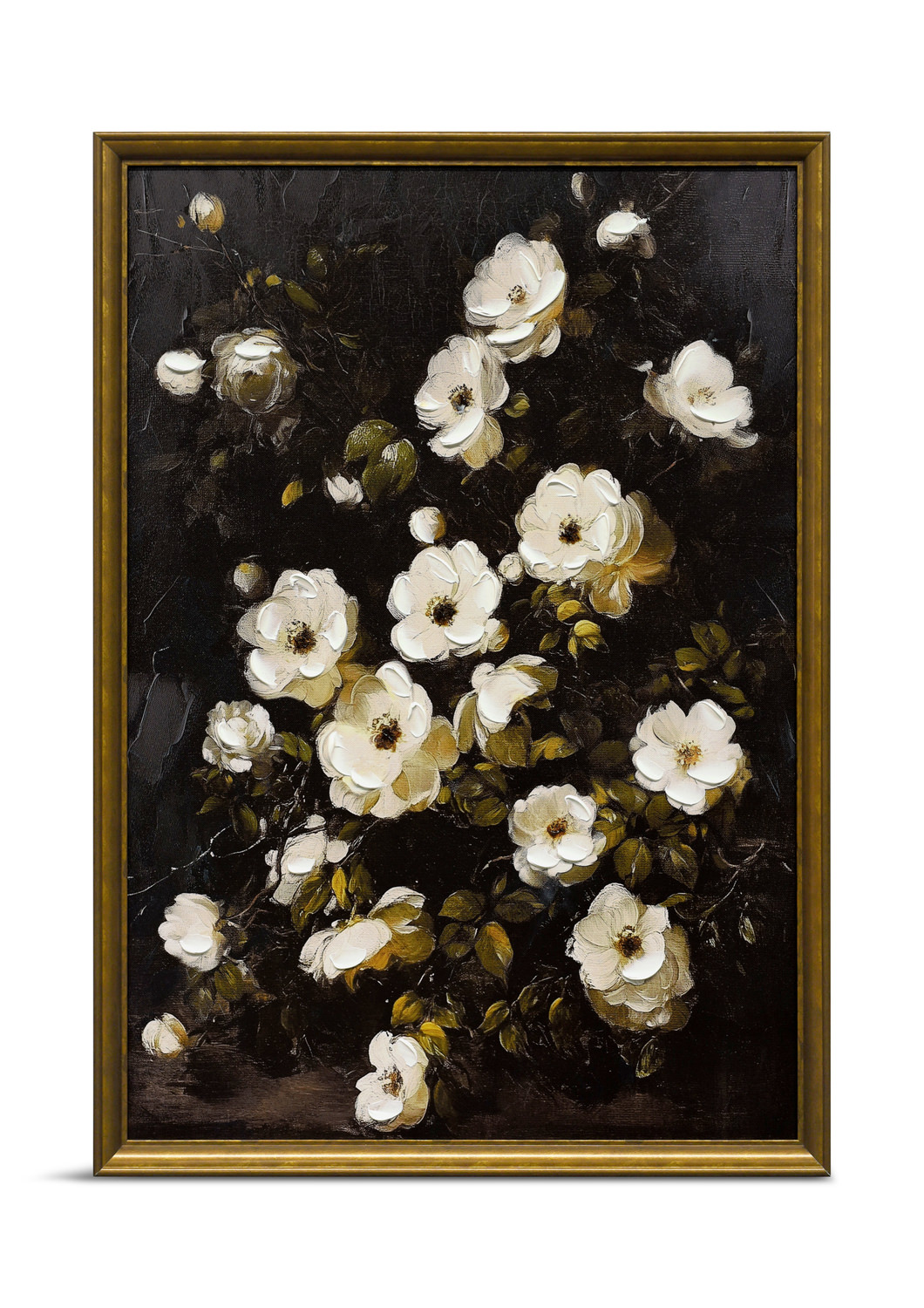 Introducing the Restless Hours Framed Art from HOM Furniture, a stunning piece that effortlessly combines elegance and tradition. This artwork features beautiful white anemone bulbs set against a dark backdrop, accented with a luxurious gold frame. The intricate design of elegant and traditional florals adds a touch of sophistication to any space. Elevate your home décor with this timeless and captivating piece that is sure to be a conversation starter.