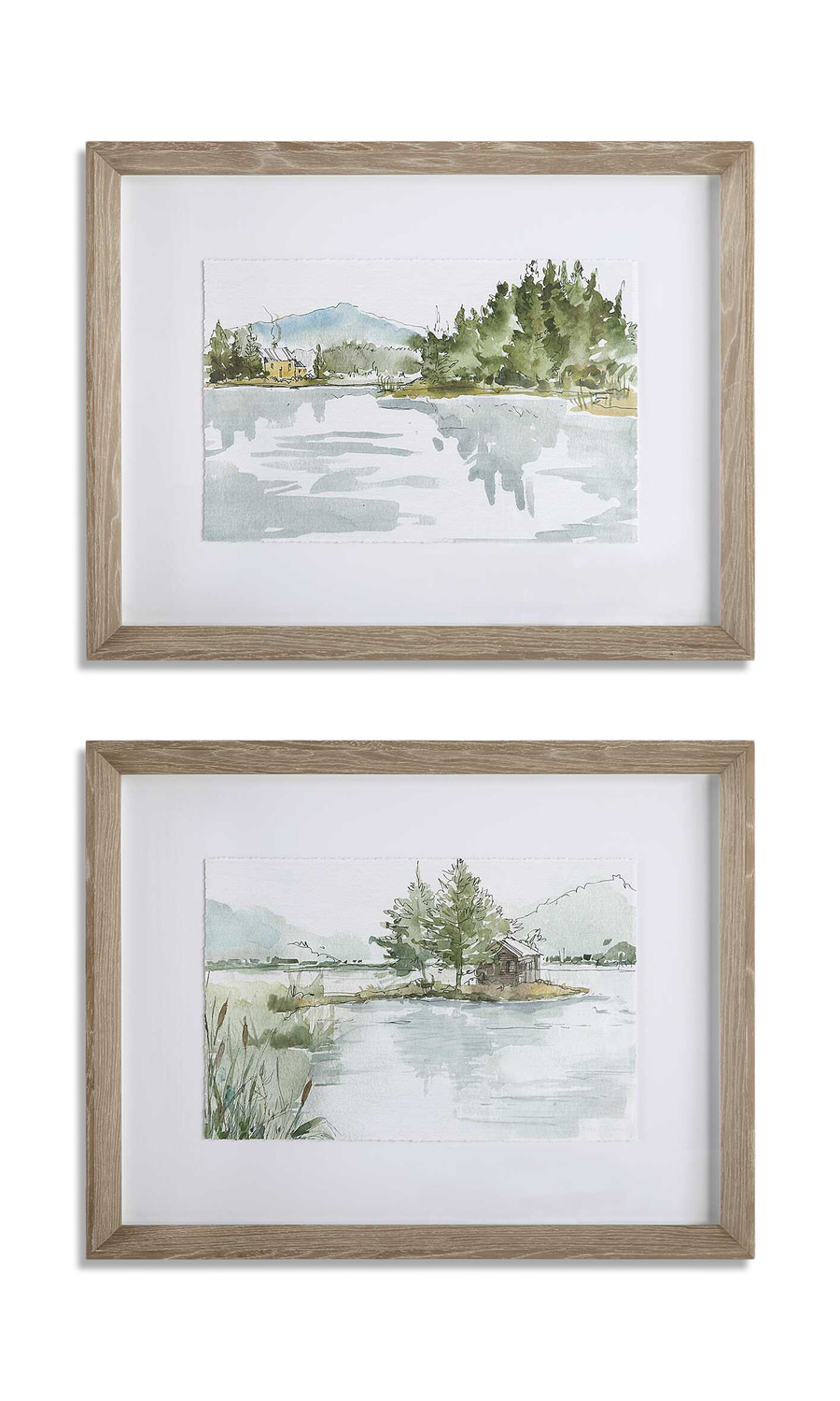 Elevate your space with the Serene Lake Framed Prints Set by Uttermost from HOM Furniture. Inspired by tranquil lake views, these watercolor-style sketches capture the essence of peaceful moments in serene shades of smokey blues, olive greens, and mustard yellows. Each landscape is beautifully accented by a white background and enclosed in a sophisticated gray washed pine frame under glass, adding a touch of elegance to your decor. Created by the talented artist Anne Tavoletti, these nature/scenic themed prints are sure to bring a sense of calm and beauty to any room.