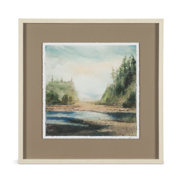 Immerse yourself in the serene beauty of nature with "Shoreline Beauty I" by HOM Furniture. This stunning framed art piece effortlessly transports you to a tranquil riverside at dawn, where the watercolor landscape unfolds before your eyes. The peaceful reflection of the scenery is captured in a harmonious blend of soft blues and earthy greens, creating a sense of calm and tranquility in any space. This framed art is perfect for adding a touch of nature and elegance to your home décor.