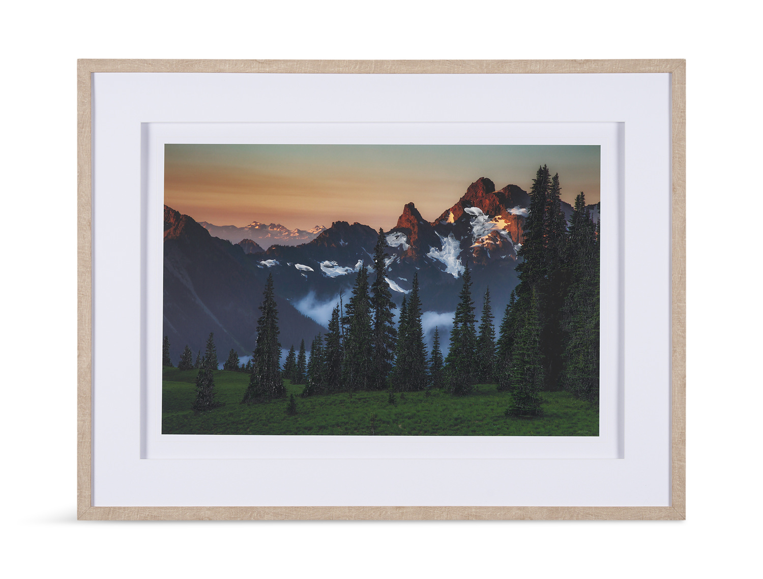 Introducing the Sunrise Morning Framed Art, a captivating piece that brings the beauty of a mountain scape to your space. Rich in earth tones, this artwork features a striking nature scene with pine trees and the sunrise rising in the background. The light oak frame and matted finish add a touch of elegance to this piece. Perfect for adding a touch of serenity and natural beauty to your home décor.