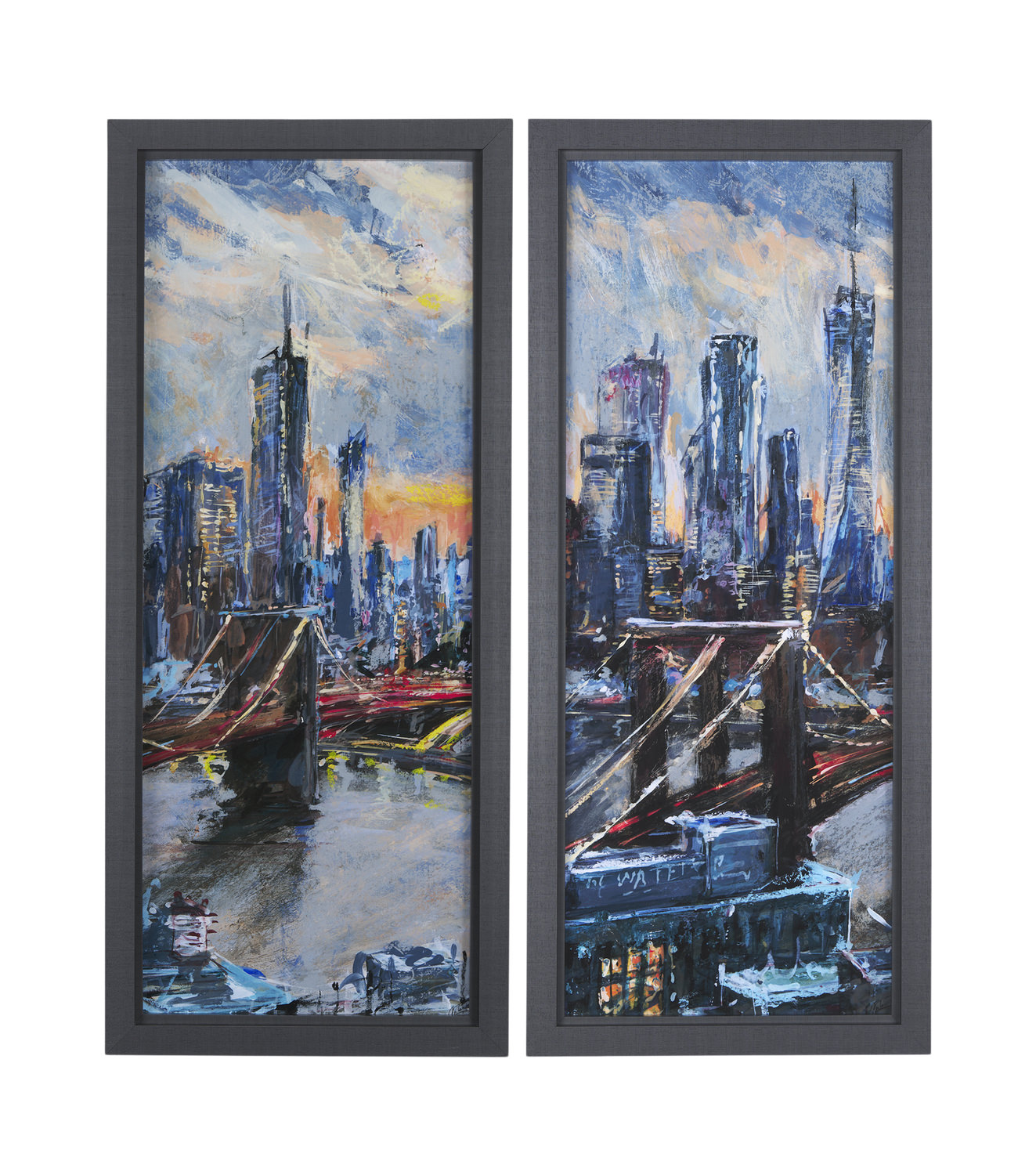 Let the dynamic energy of the city come alive in your home with the Set of Two Sunset Framed Prints. Featuring a stunning NYC cityscape design, these prints boast a colorful Illustration, and abstract influence with contemporary brushwork, all expressed in a 'Roy G Biv' Vibe. The blurred style and emphasis, deliver an extra layer of dynamic charm, making this artwork pair a grand addition to modern living space and an eye-catching display.