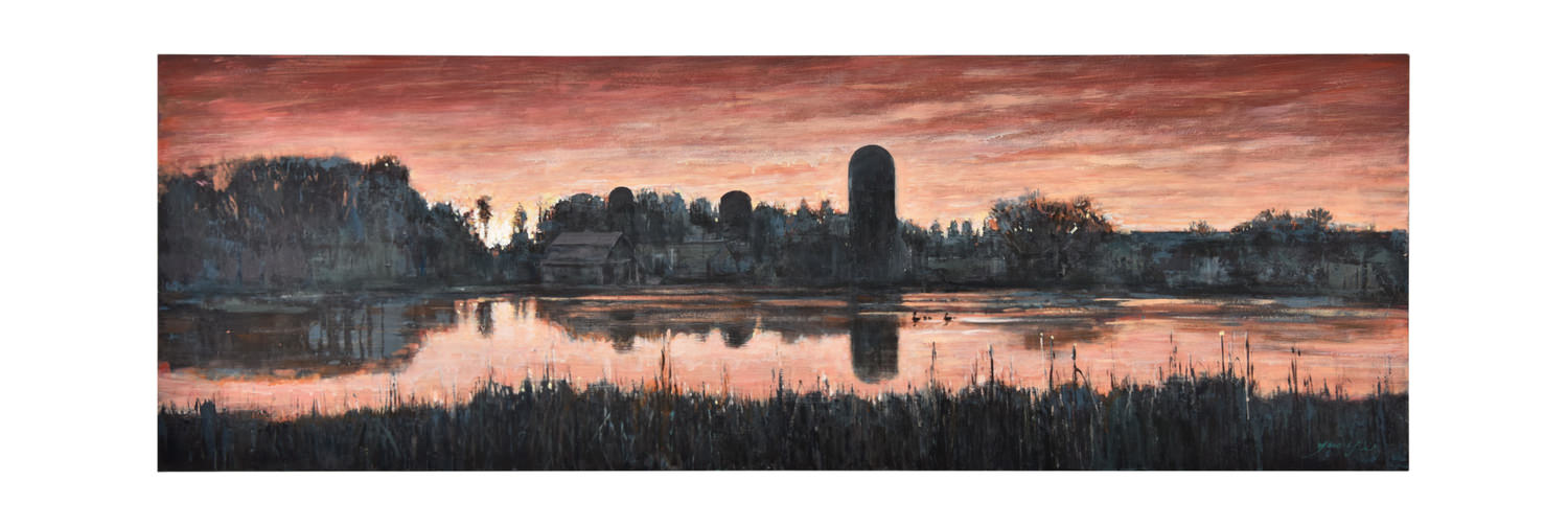 Rich warm tones of the sunset fading, the Sunset On The Farm is both reflective and restful, in its appearance. The ombre layers of the sky are contrasted by the deep tones of the landscape and large farm represented in this large print.