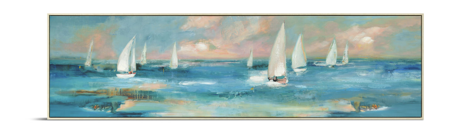 Immerse yourself in a tranquil oasis with the Swiftly Flown Away Framed Canvas by HOM Furniture. This stunning piece brings a sense of calm and serenity to any space with its beautiful blend of blues and greens gracefully painted across the canvas. Picture yourself sailing away with a flotilla of sailboats floating across a large body of water, each detail expertly hand-painted to perfection. This framed art piece is a true masterpiece, capturing the essence of adventure.