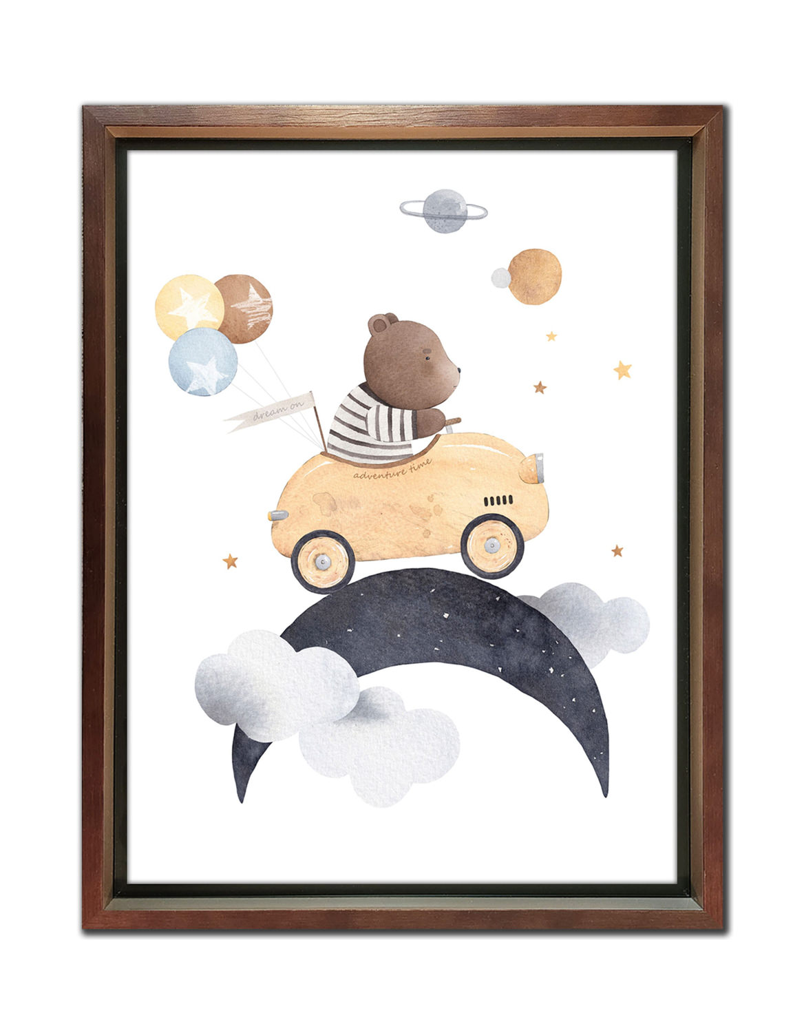 This delightful framed art from HOM Furniture Teddy Rides the Moon Framed Print, adds a splash of youthful fun to any room. Featuring an adorable bear driving over the rainbow amongst the stars and planets, this piece is set against a white background and has a medium brown finished frame that makes for an eye-catching contrast. The soft multi-color palette ensures an easy fit, drawing the eye and helping tie the room together. Plus, with our ‘Love it’ guarantee, you can rest assured you’ll be happy with your purchase.