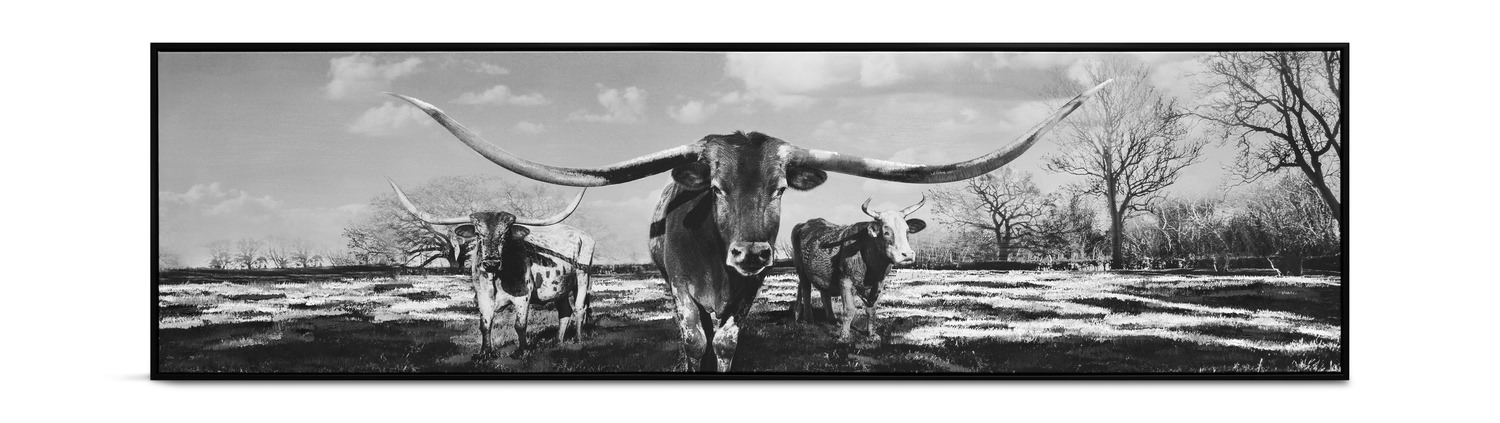 Introducing the This Time Of Fear Framed Canvas from HOM Furniture! This stunning piece effortlessly marries urban flair with rustic charm, making it a must-have for any modern home. The sleek black frame adds a touch of sophistication, while the hand-painted scene of three Texan longhorn cows standing in a peaceful pasture brings a sense of tranquility to your space. Embrace the adventure of the Wild West with this captivating horizontal artwork, featuring a striking black and white color palette that will complement any décor style.