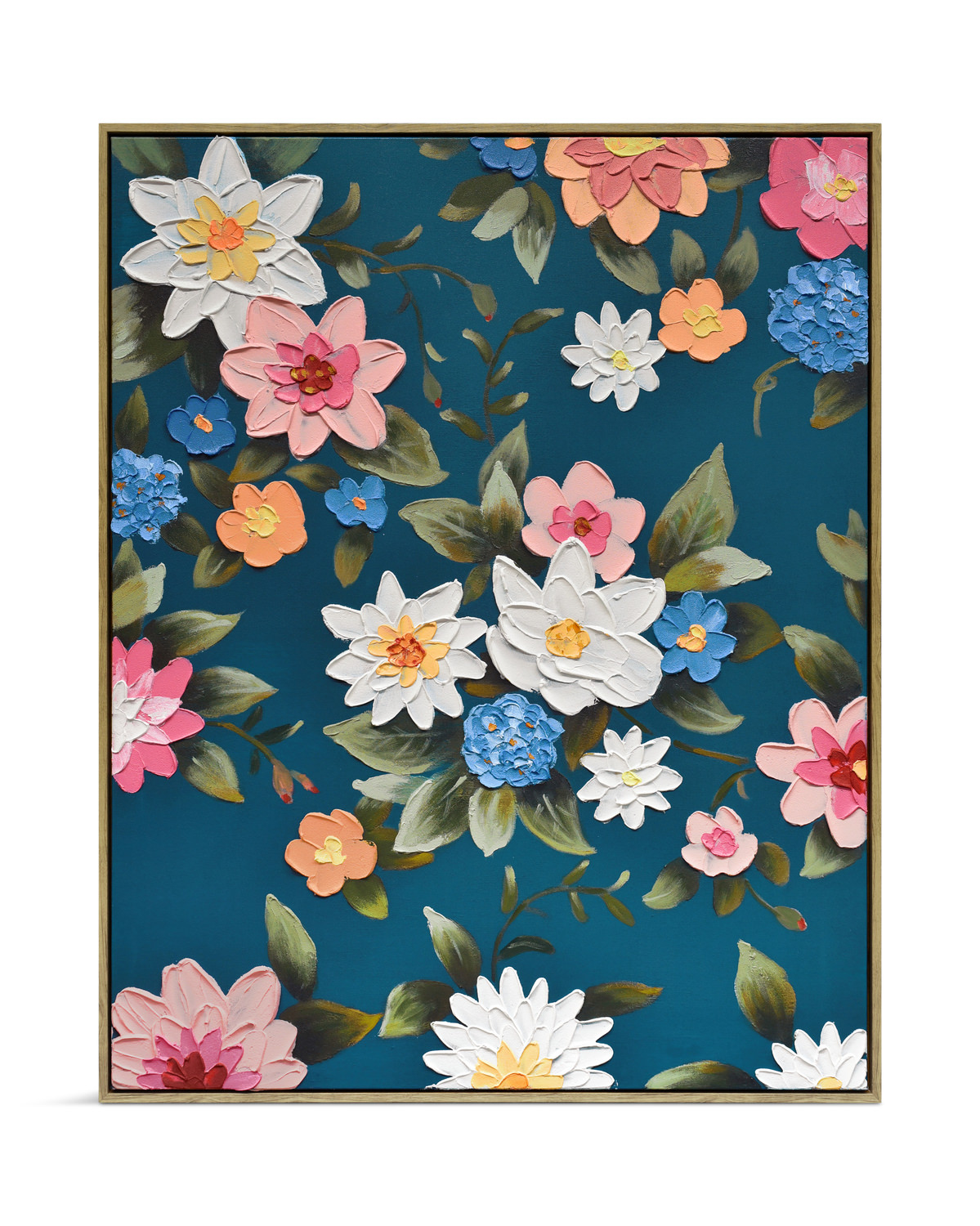 Introducing the exquisite hand-painted framed art piece from HOM Furniture, featuring a captivating variety of florals in a myriad of colors. Set against a stunning blue background, this artwork truly comes to life, with the vibrant florals popping off the canvas in a mesmerizing display of beauty. Elevate your space with this striking piece that will add a touch of elegance and charm to any room. Brighten up your home with the enchanting floral masterpiece from HOM Furniture.