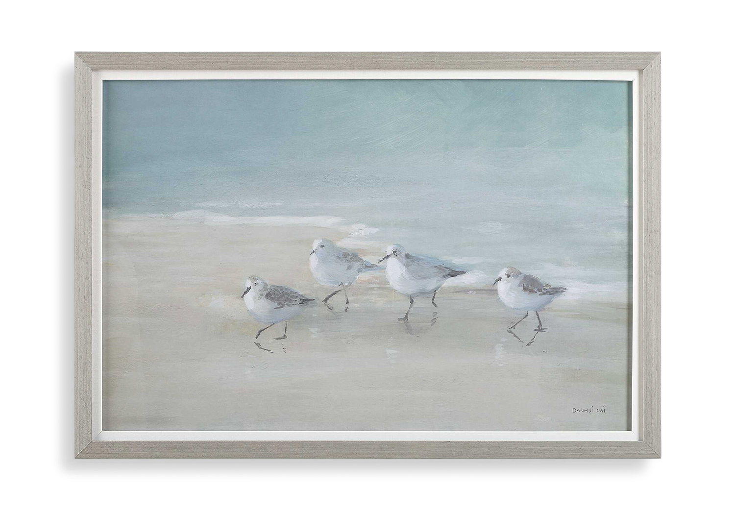 Elevate the ambiance of your living space with the Tranquil Shorebirds On The Sand Framed Print from HOM Furniture. This captivating artwork, featuring the serene beauty of shorebirds on the coast, boasts soft tones of blue, green, and beige that effortlessly evoke a sense of calm and tranquility. The delicate balance of colors makes it a perfect addition to coastal-inspired interiors, bringing a touch of nature indoors. Crafted with attention to detail, this print is accented by a light gray wood toned frame with a linen liner, adding a touch of elegance to the piece.