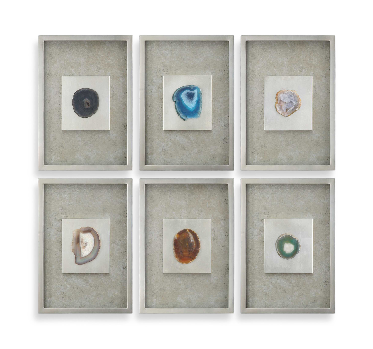 Transform your living space with the exquisite Silver Leaf Shadow Boxes from HOM Furniture. These stunning pieces feature mottled silver champagne backgrounds that perfectly showcase the vibrant slabs of colorful agate stone encased under glass. Each agate stone is unique in shape and color, adding a touch of natural beauty to your home decor. From the renowned Uttermost brand, these shadow boxes are finished in a sophisticated grey/gray color palette, making them a versatile and elegant addition to any room. Elevate your interior design with this captivating Agate Stone Silver Wall Art Set of 6 from HOM Furniture.