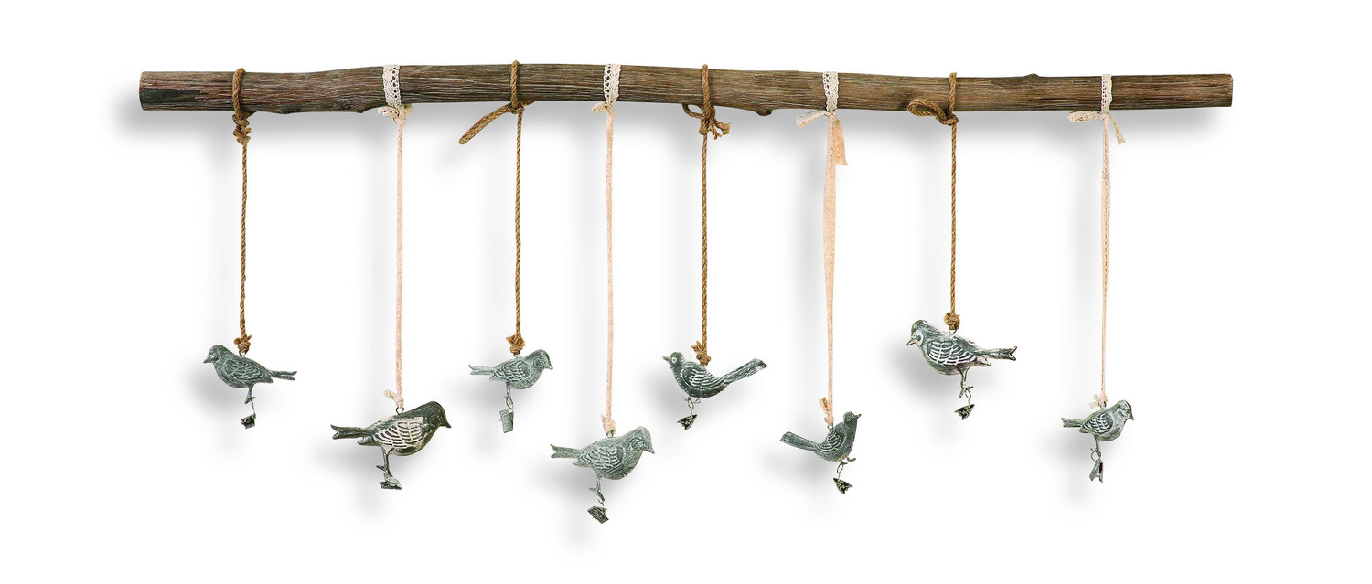 • Small Metal Birds Finished In A Dark Bronze With A Light Ivory Glaze Suspended From A Natural Elm Branch With Ivory Ribbon And Natural Rope. Each Bird Has A Clip At Feet For Hanging Pictures Or Notes. Size And Shape Of Branch Will Vary.