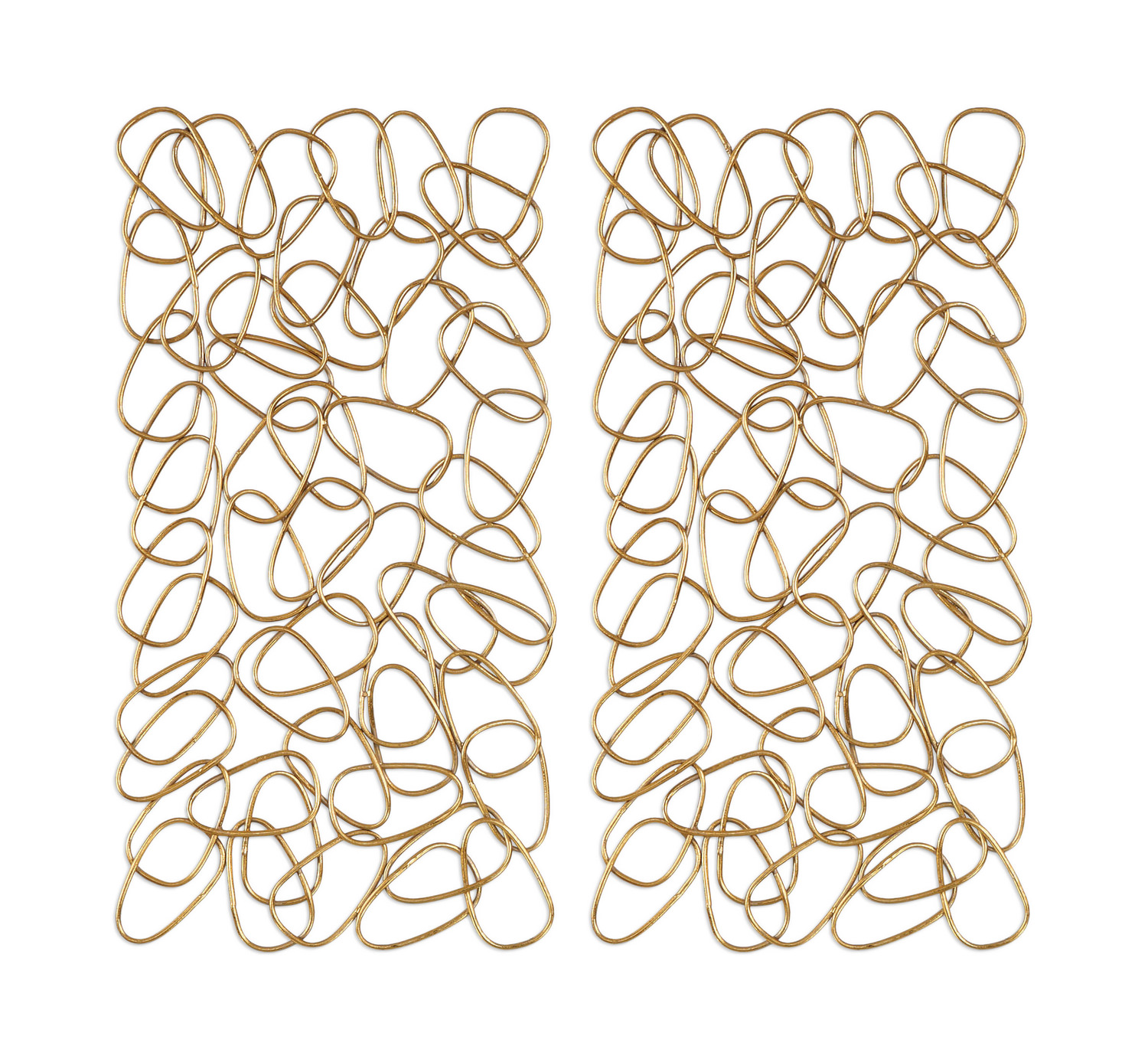 Elevate your space with the In The Loop Gold Wall Art Set from HOM Furniture, featuring panels of individually pieced loops of hand-forged iron with a luxurious soft gold leaf finish. Each piece is meticulously crafted, showcasing exquisite detailing and a rich gold color that exudes elegance and sophistication. Enhance your decor with this stunning Uttermost brand wall art set that adds a touch of glamour and allure to any room. The handcrafted technique ensures that each piece is unique, adding character and charm to your living space.