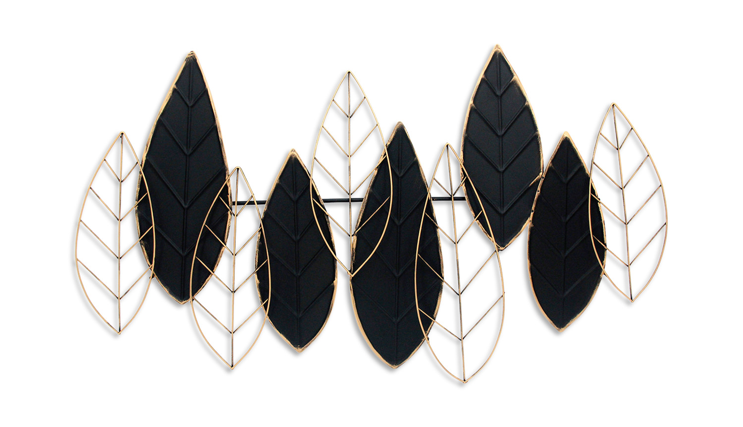 An alignment of leaves alternating from open to black finished faces, the Leaf Wall Decor hangs horizontally, on the wall surface. This assemblage of leaves is a great way to bring an organic feel to casual interiors.