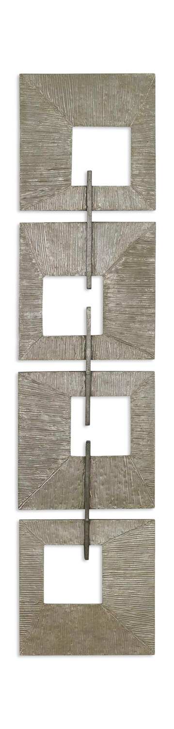 Elevate your space with the Linked Champagne Metal Wall Decor from HOM Furniture. This exquisite wall panel, brought to you by Uttermost, is a textural showpiece that exudes sophistication and elegance. The ridged metal sheeting in a luxurious champagne gold finish is connected by iron bars in a heavily aged silver tone, creating a striking contrast that captivates the eye. Versatile and impactful, this wall decor can be hung horizontally or vertically to suit your space and design preferences. For a truly dramatic statement, group multiple panels together to create a stunning focal point in any room.