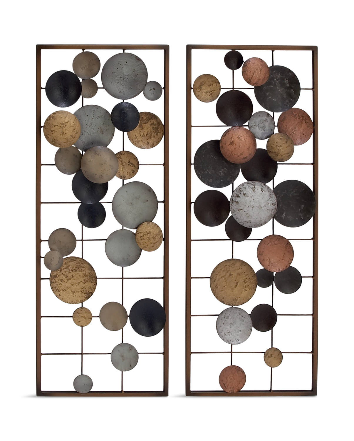 A metal, brown grate background, with round, solid metal discs in various colors and finishes, the Multi-Colored Disc Wall Decor, has a familiar "planet-like" appearance. Place this modern galaxy and science-inspired panel, on any surface to create a contemporary effect. These panels are an assortment, of two contrasting patterns, not a set or pair.