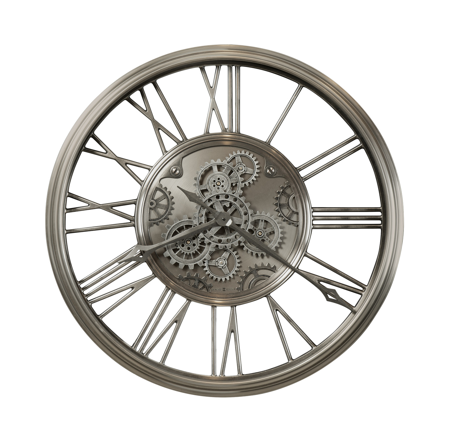 This HOM Market Accessories' Rafa Wall Clock is a timeless piece of art with its open dial background and moving gears finished in antique silver. Featuring cast metal construction with a satin nickel finish, this clock is powered by a quartz movement and requires one AA battery, plus four C batteries to operate. The charcoal-finished hands feature an open fret, cut diamond style. Add this 34" round wall clock to your home for an elegant and sophisticated touch.