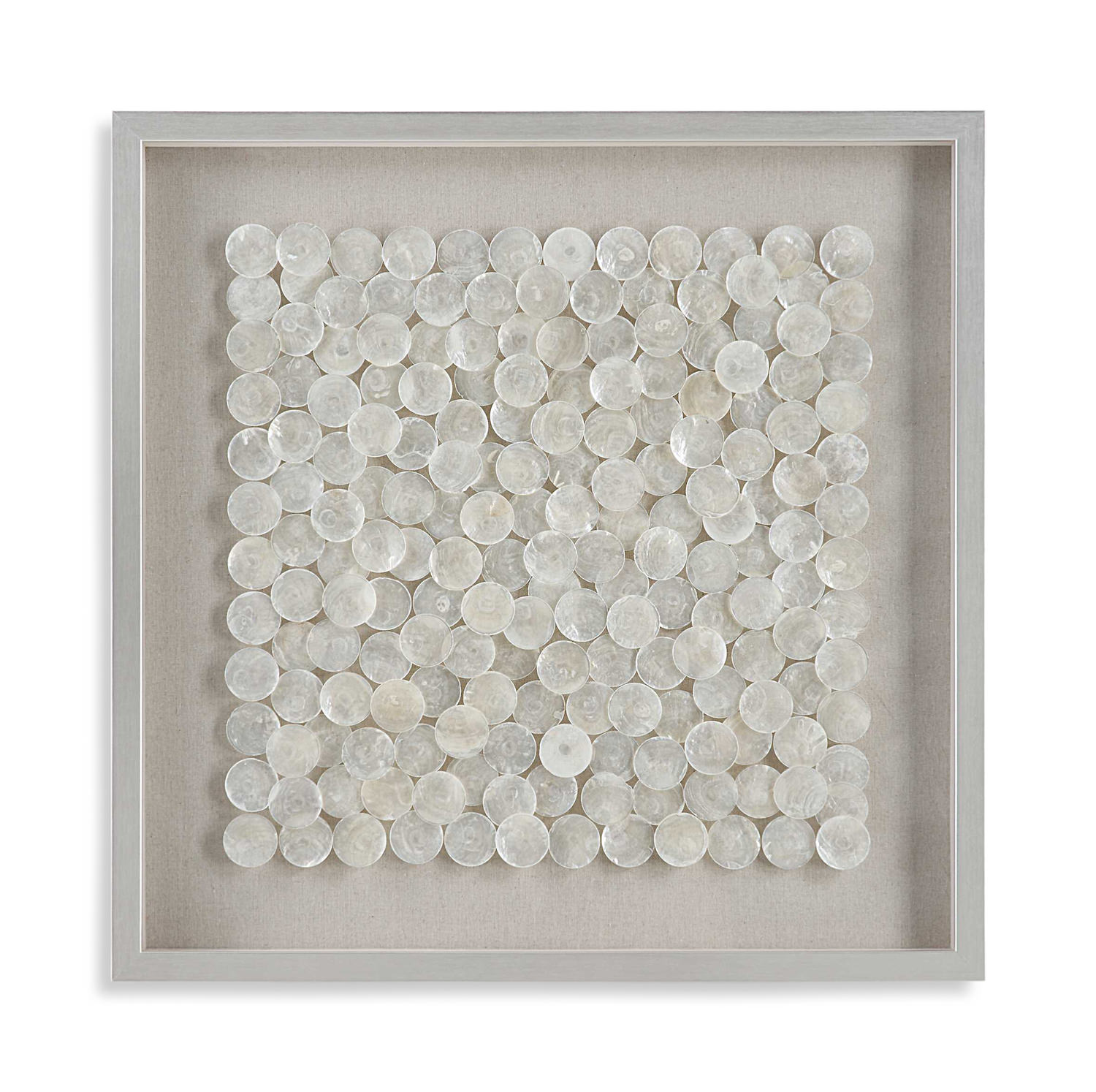 - Known As The Windowpane Oyster For It's Transparent Qualities, The Natural Layered Capiz Shells Shimmer In This Shadow Box Style Wall Piece. Placed Over A Flax Toned Linen Backing In A Pine Wood Frame Finished In Brushed Silver.